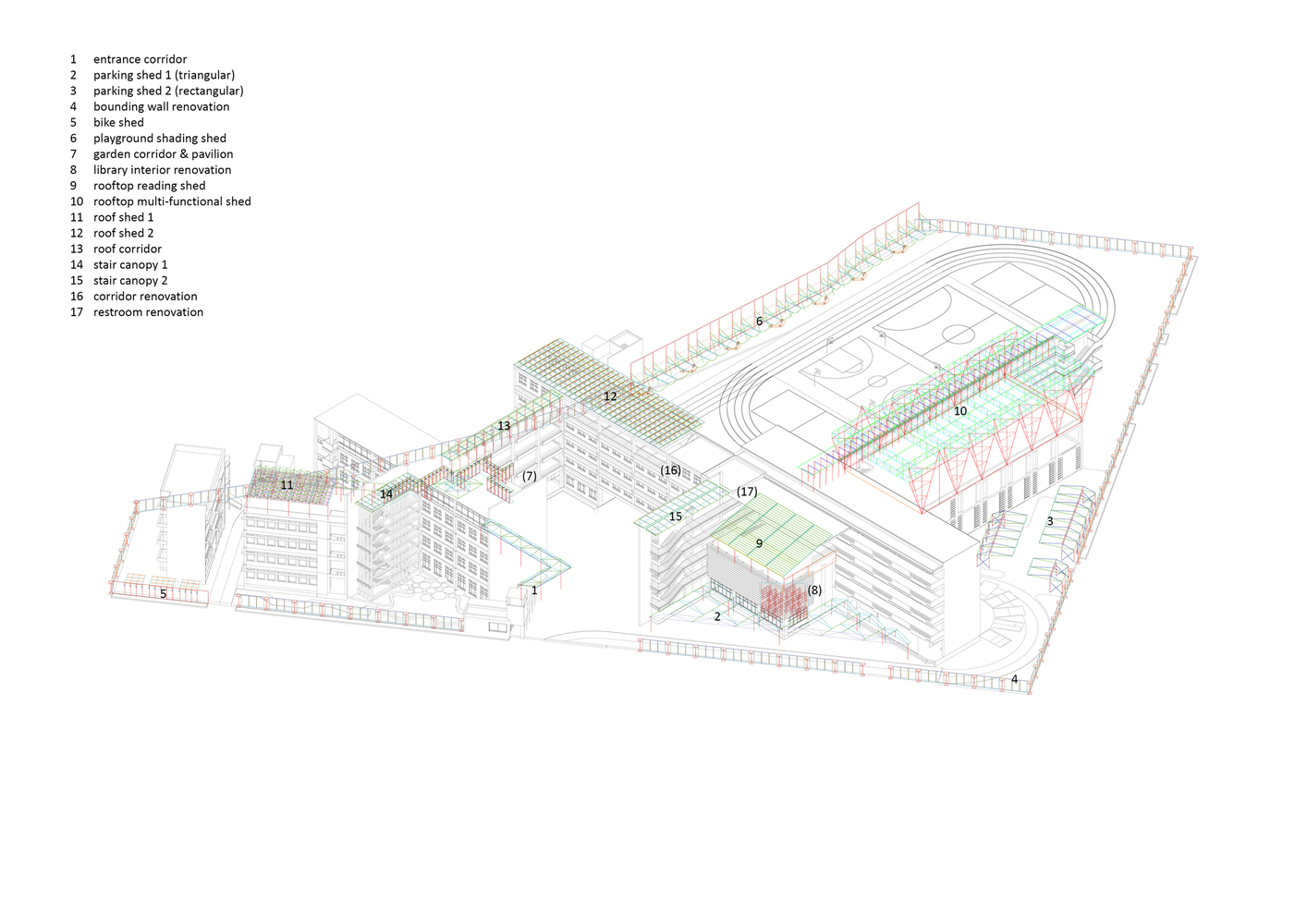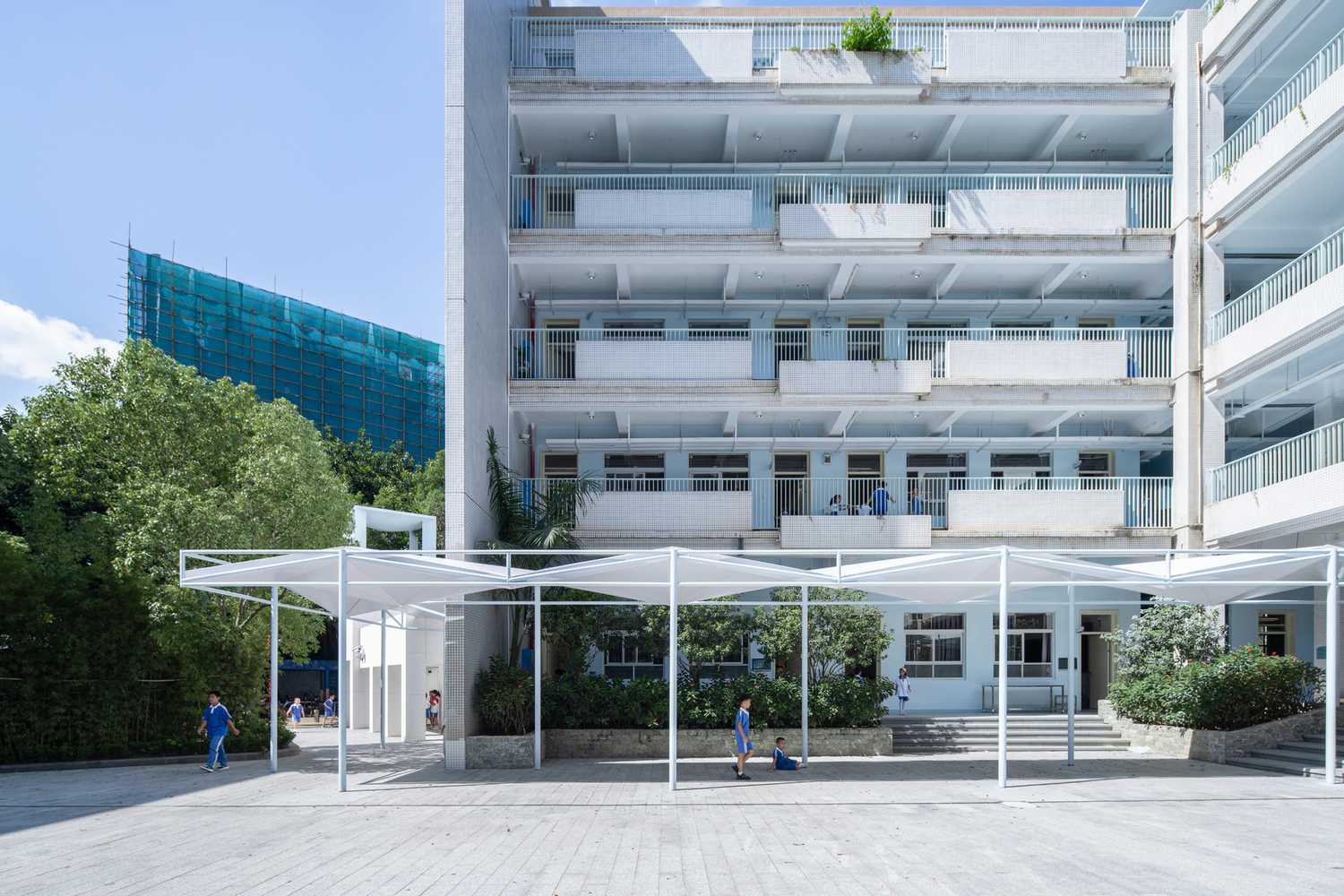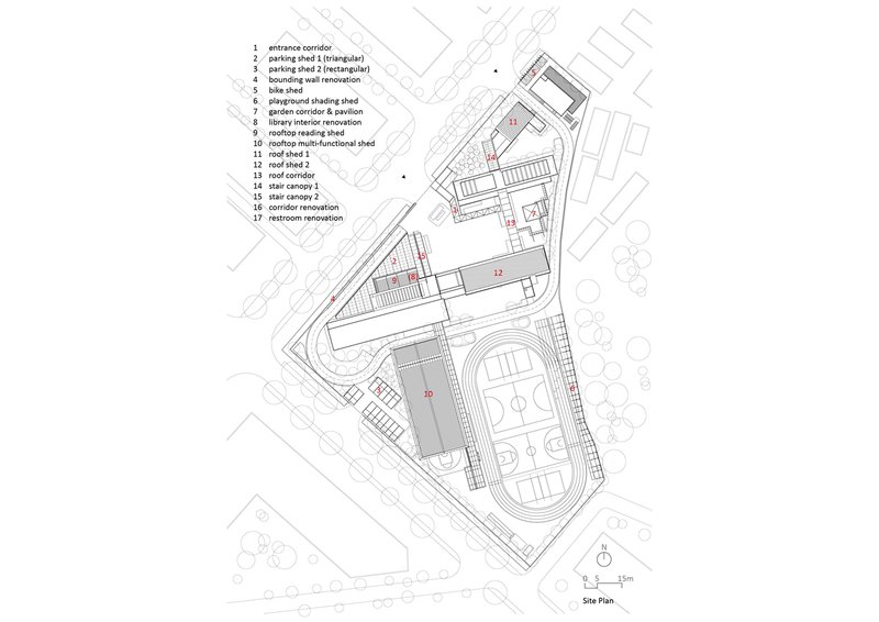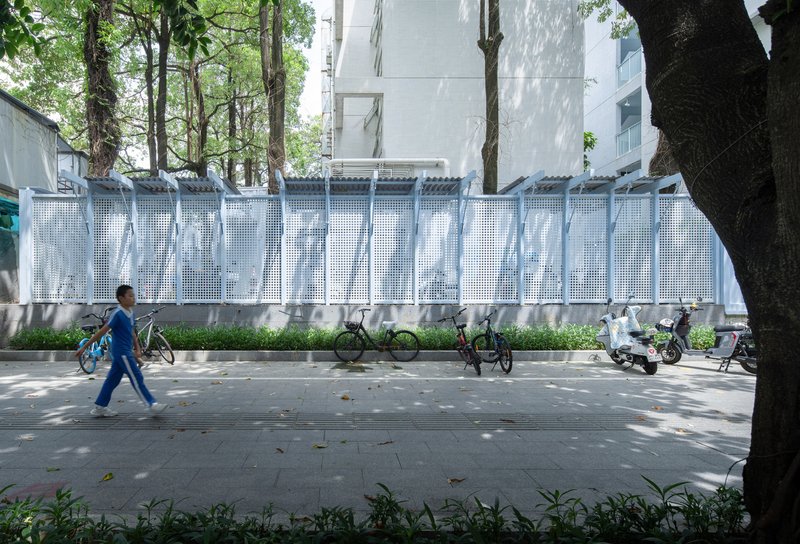 The renovation of outdoor spaces also included the creation of a cantilevered bicycle shed and playground shading structures. These elements were integrated into the existing fence, utilizing the height difference between the campus and the street. The shading structures were designed with lightweight, translucent roofs that allowed for natural light and air circulation, while simultaneously providing shelter from the elements. The playful design of these spaces complemented the overall goal of creating a functional yet visually stimulating environment for students.