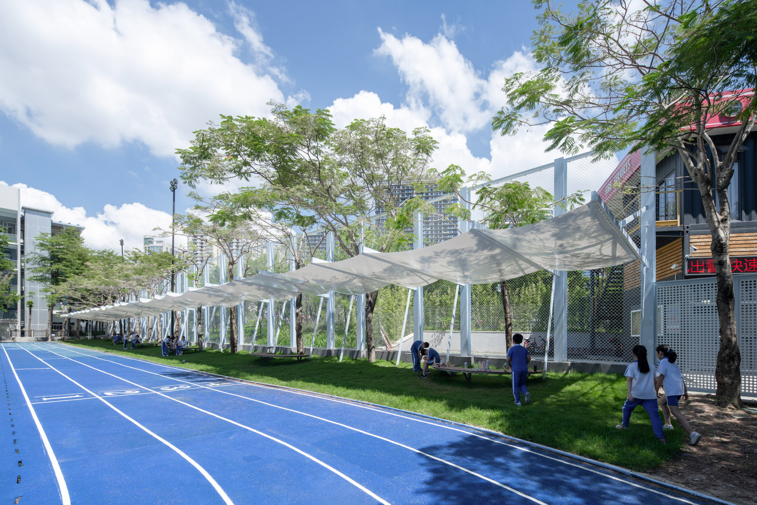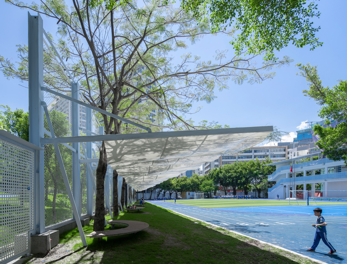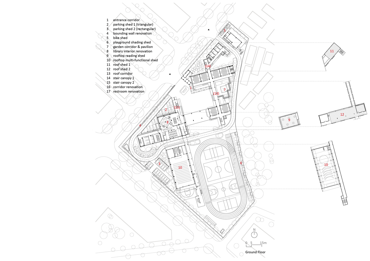 The renovation of outdoor spaces also included the creation of a cantilevered bicycle shed and playground shading structures. These elements were integrated into the existing fence, utilizing the height difference between the campus and the street. The shading structures were designed with lightweight, translucent roofs that allowed for natural light and air circulation, while simultaneously providing shelter from the elements. The playful design of these spaces complemented the overall goal of creating a functional yet visually stimulating environment for students.