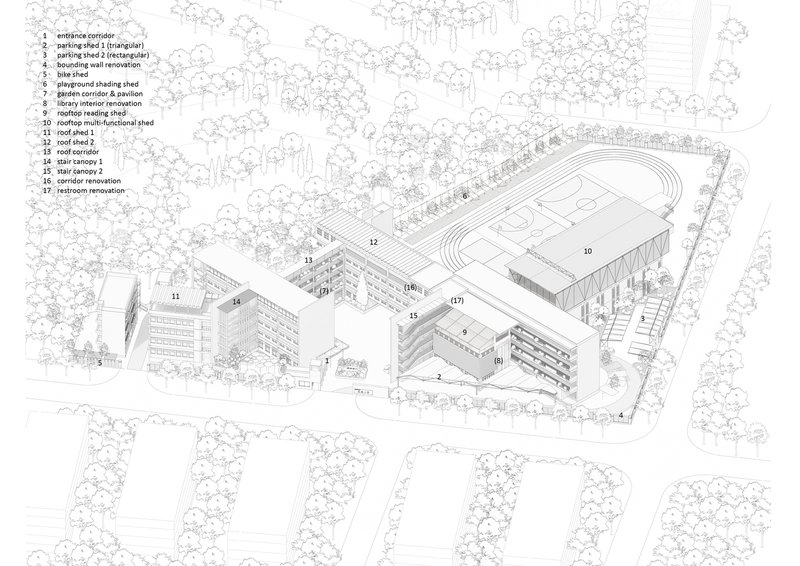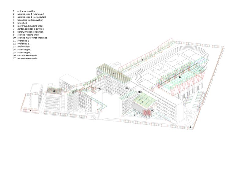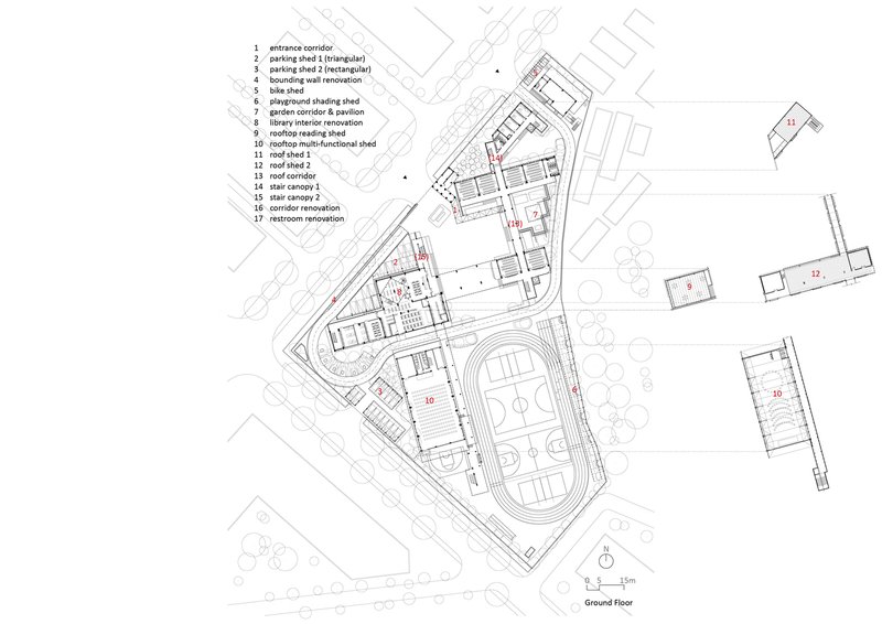 One of the main challenges of the renovation was dealing with the "remaining spaces" created by the collision of orthogonal structures inside the campus and the polygonal street interface outside. These spaces, often underutilized, were redesigned through various elements such as entrance corridors, parking sheds, folding courtyards, and pavilion installations. These adjustments not only met the school’s functional needs but also enriched the spatial character of the campus, offering students and faculty an engaging and dynamic environment.