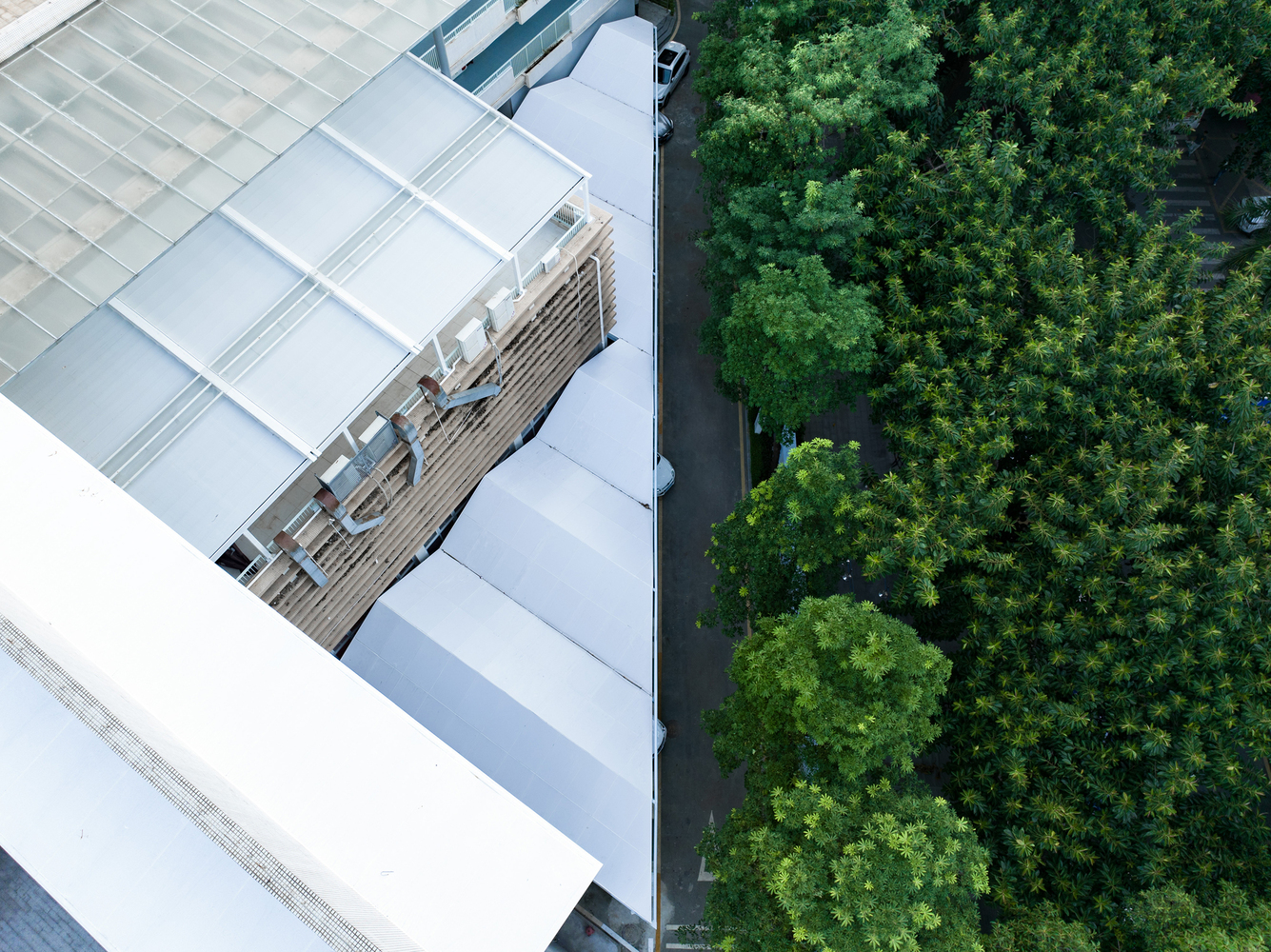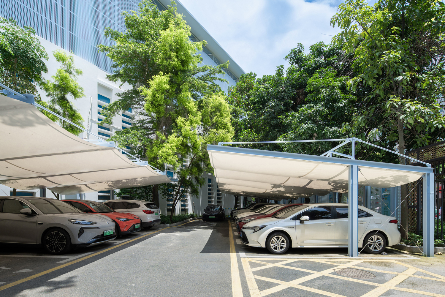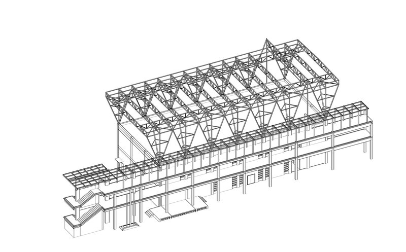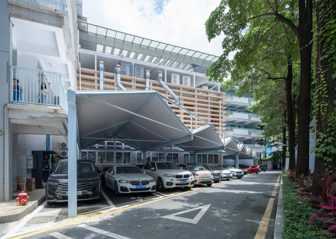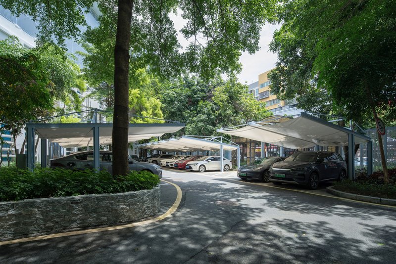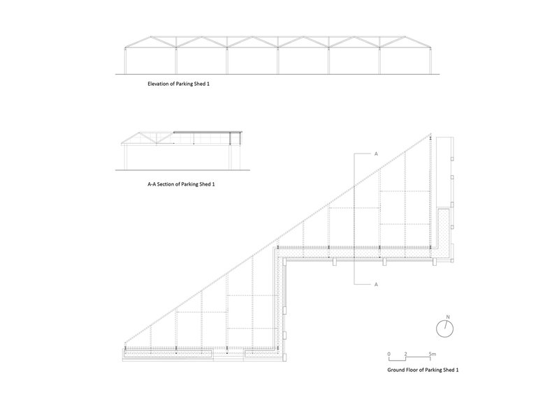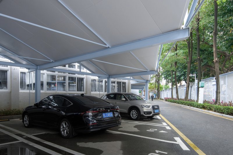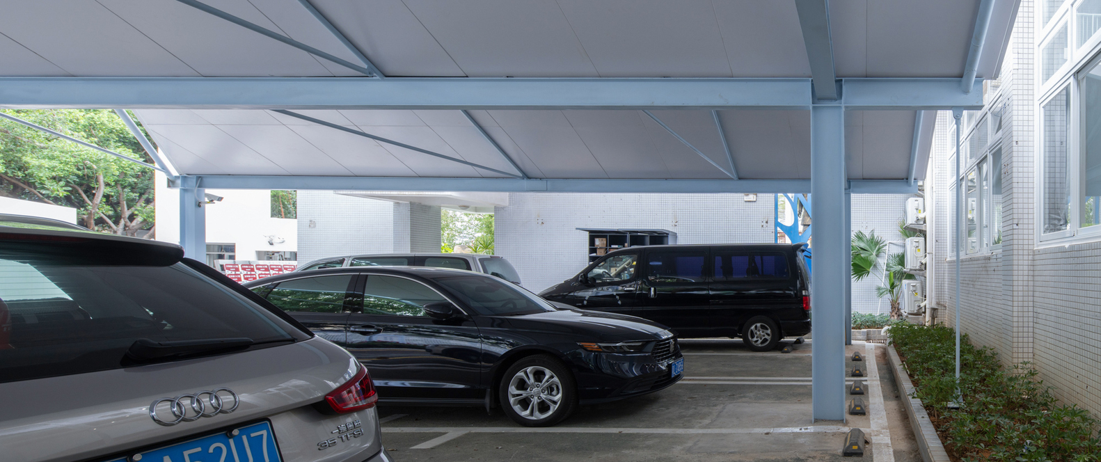 The existing parking sheds were redesigned to address issues such as roof leakage and column interference. The new parking sheds, one triangular and one rectangular, followed the orthogonal grid of the school’s main building but improved the functionality by eliminating columns and incorporating cantilevered roof structures. These roof structures allowed for a column-free space, enhancing the usability of the parking areas and enabling more efficient vehicle maneuverability.