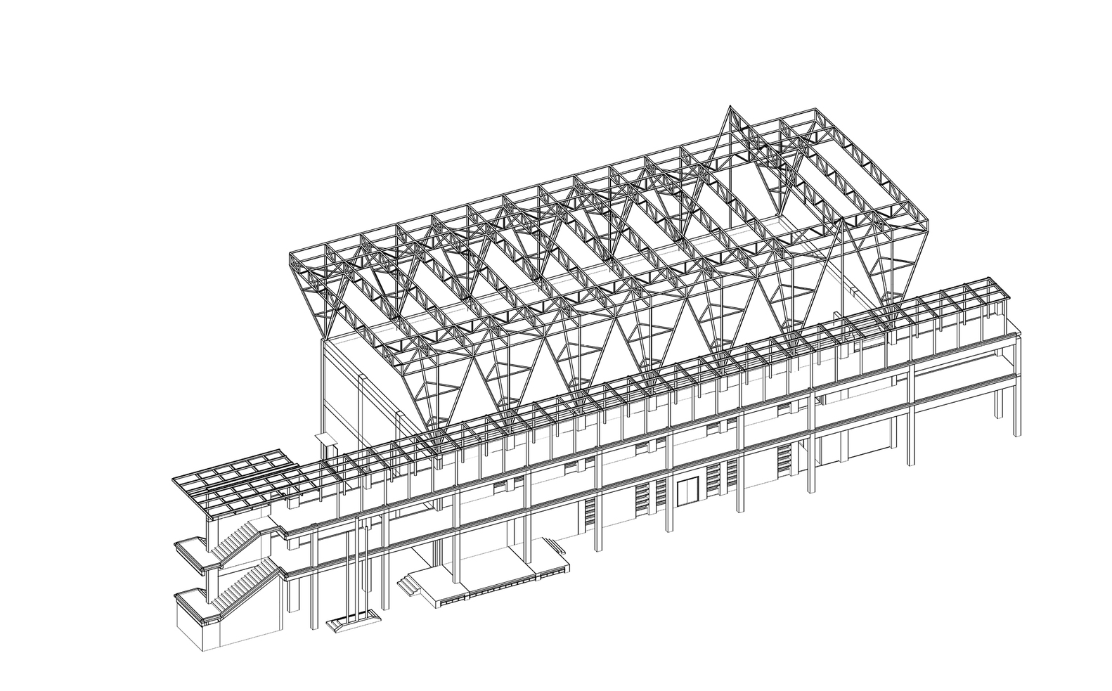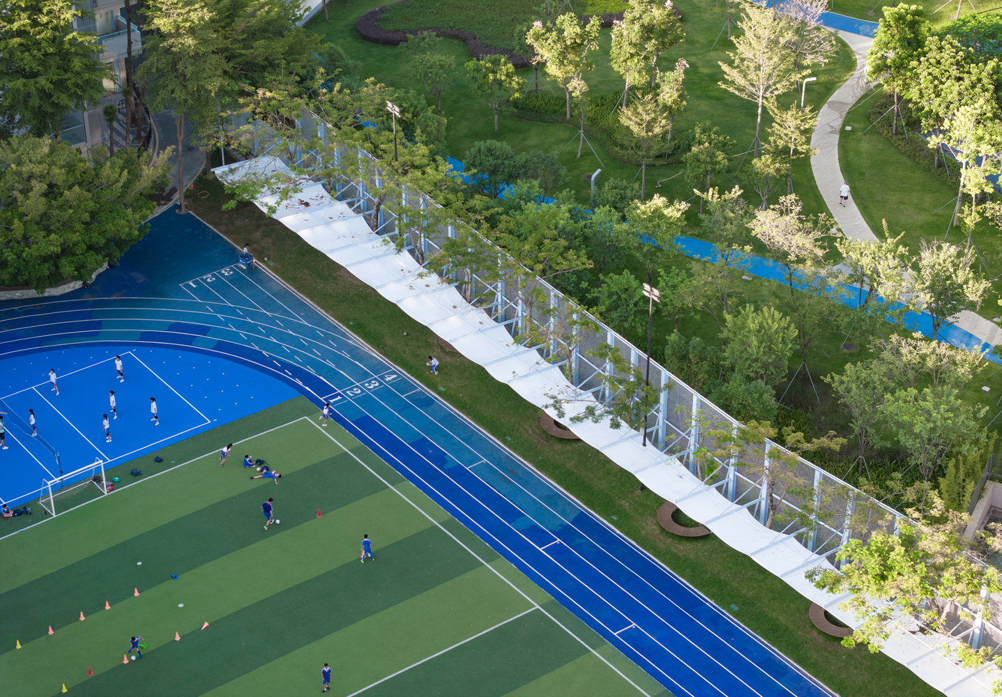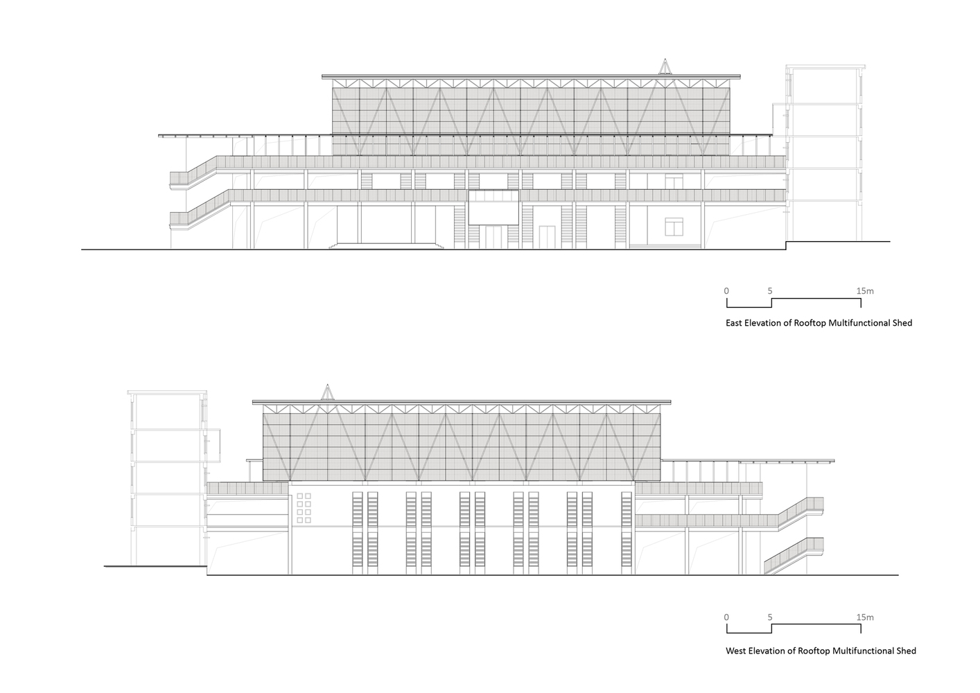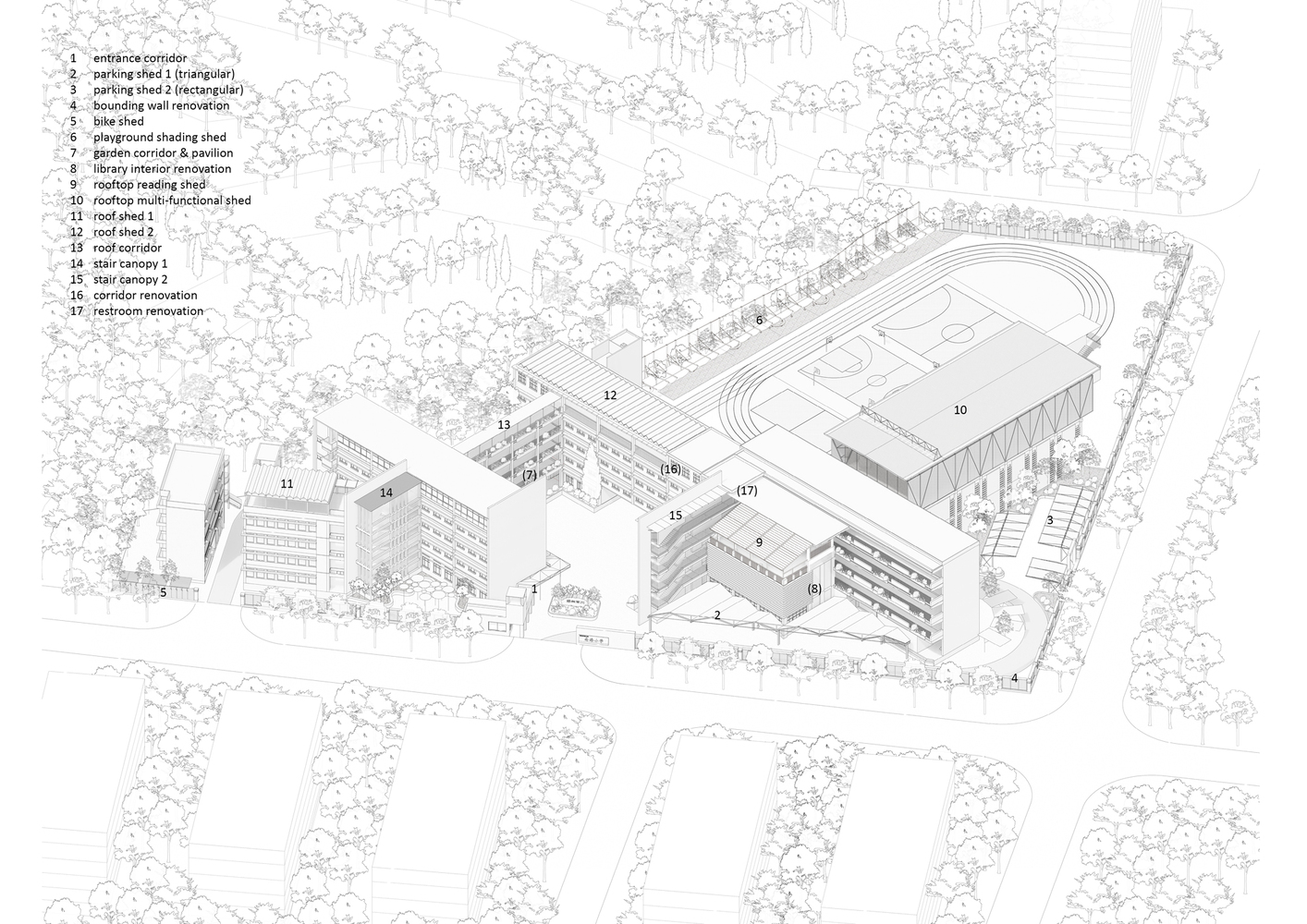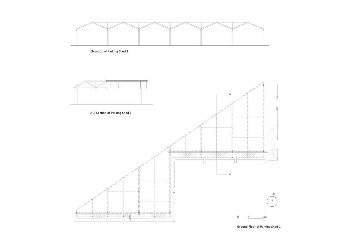 The existing parking sheds were redesigned to address issues such as roof leakage and column interference. The new parking sheds, one triangular and one rectangular, followed the orthogonal grid of the school’s main building but improved the functionality by eliminating columns and incorporating cantilevered roof structures. These roof structures allowed for a column-free space, enhancing the usability of the parking areas and enabling more efficient vehicle maneuverability.