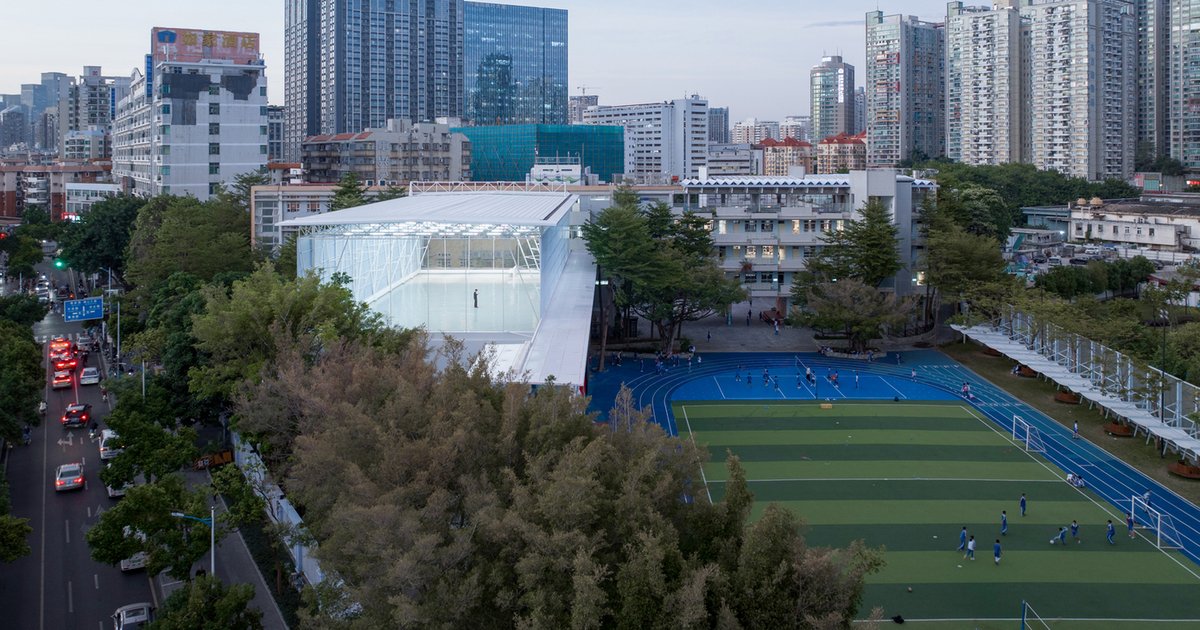 A primary school renovation in Foshan, China replaces rigid boundaries with tensile membranes, perforated screens, and open-air learning landscapes.