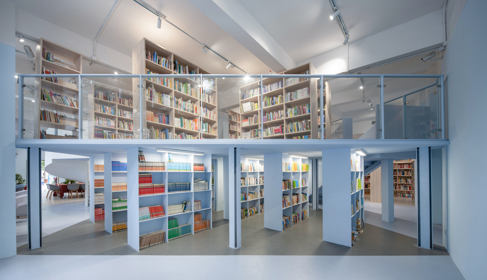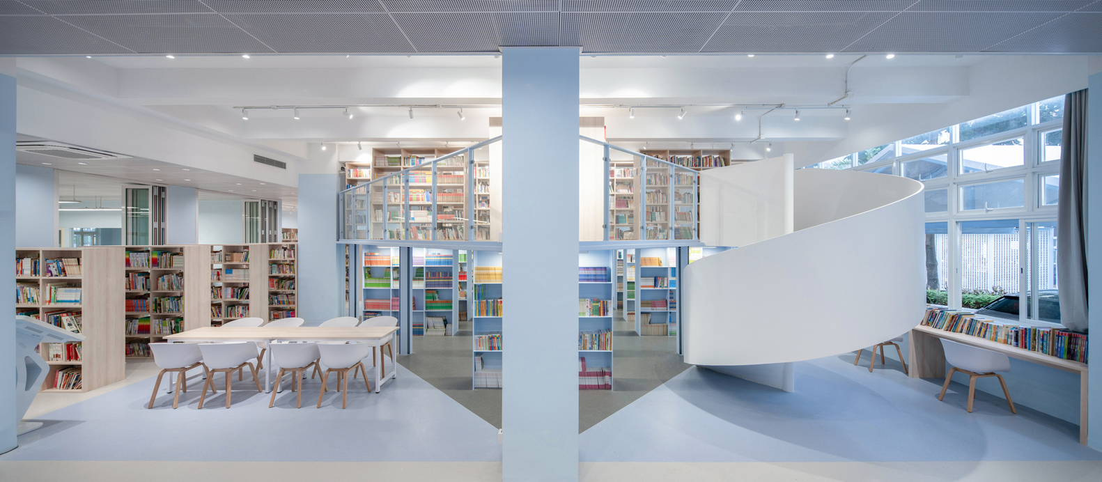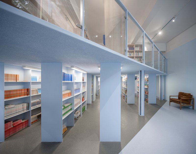 In the library, the introduction of a mezzanine added new functional space while respecting the building’s original layout. The architects implemented a creative solution by using steel plate-lattice columns under the mezzanine, minimizing structural thickness while ensuring stability. The mezzanine was rotated 45 degrees to optimize natural lighting, ensuring that students could continue to enjoy the library’s west-facing windows. The overall design created a fluid space that integrated new and old elements seamlessly.