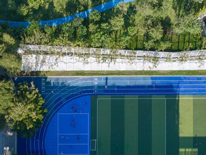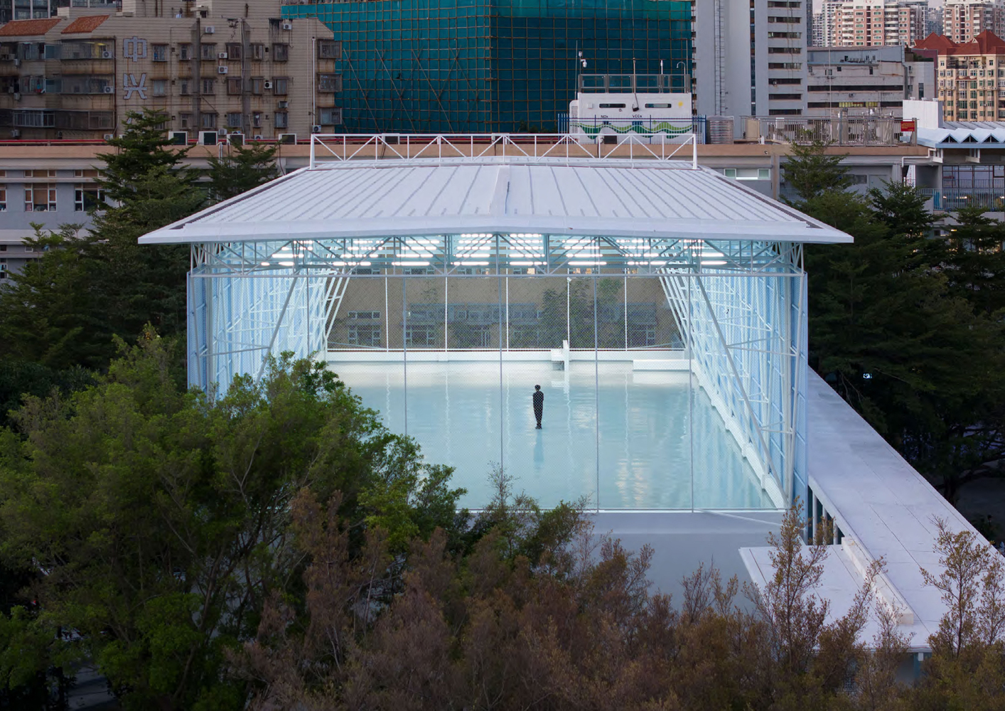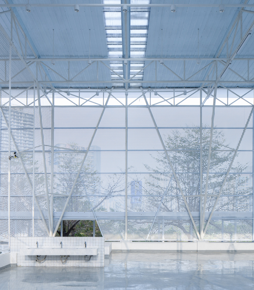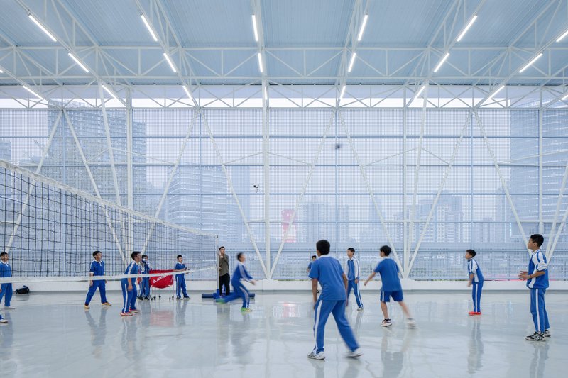 The renovation of the rooftop multifunctional shed presented a unique structural challenge due to the limited span of the existing columns. Chen Donghua Architects implemented an innovative design where the shed’s truss system incorporated reverse beam forms, creating a dislocation in the original order of the columns. This design resulted in a natural yet dominant structural mutation, which was both relaxed and visually striking. The light, floating nature of the shed was achieved through the use of slender steel frames, making it feel as if it were hovering above the treetops.