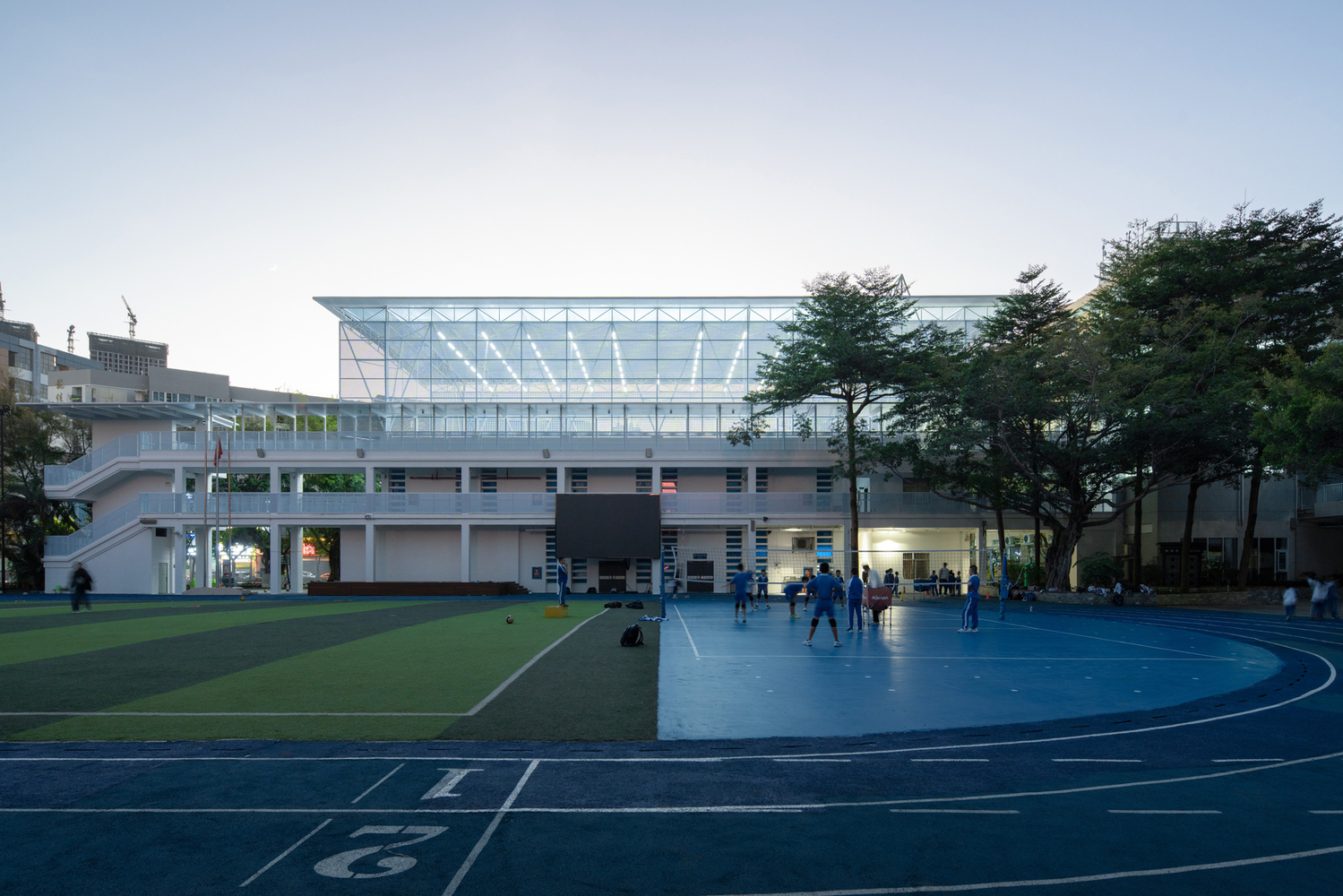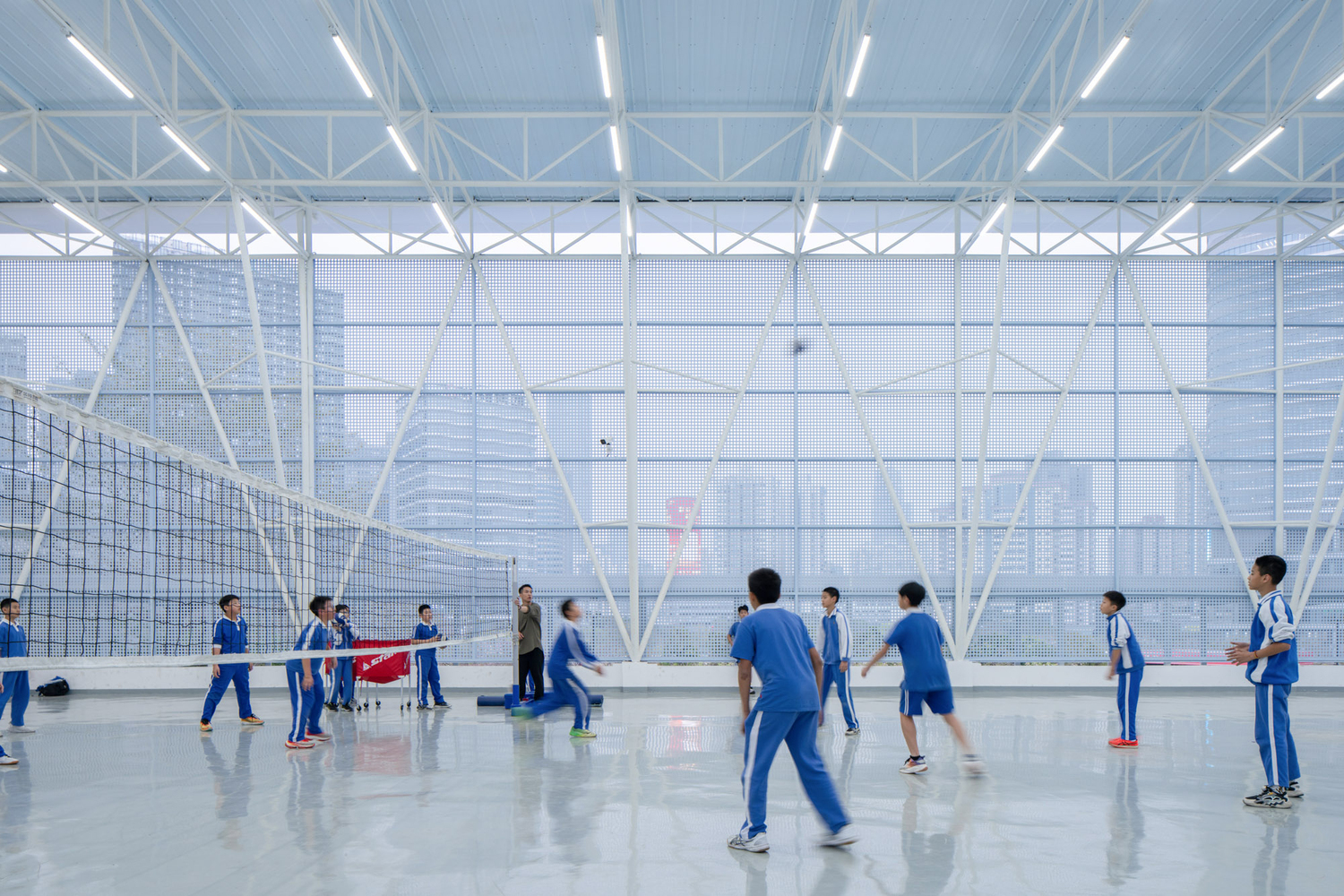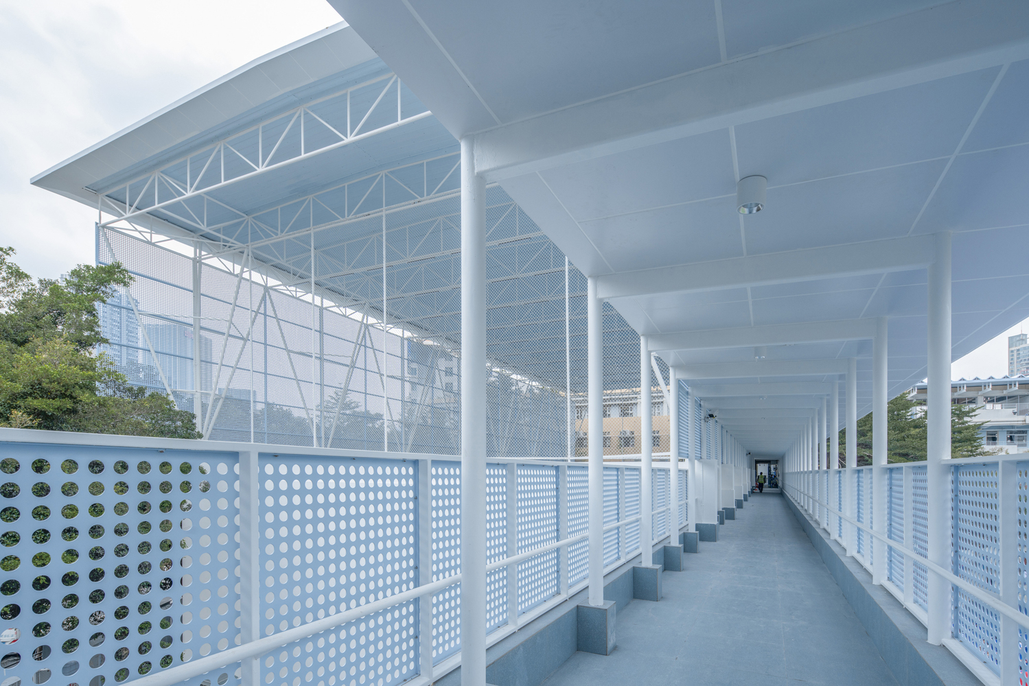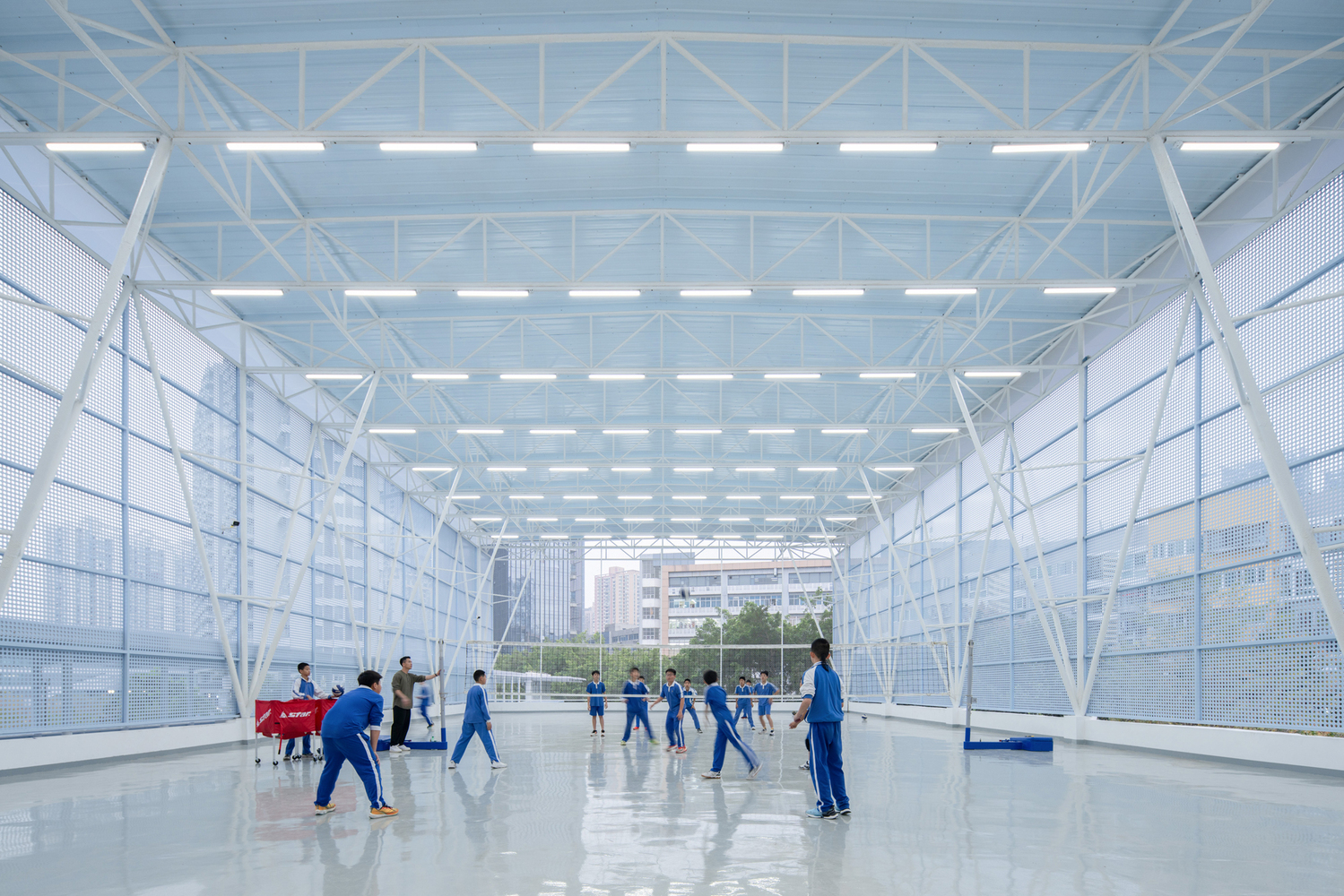 The entrance wind-and-rain corridor served as a vital link between the teaching building and the main entrance of the school. The design of the corridor was based on a diagonal layout that incorporated folded roof structures, creating a sense of movement and dynamic spatial flow. The truss beams and cantilevered columns added to the structural intrigue of the space, while the double-layer aluminum roof provided both aesthetic appeal and functional waterproofing.