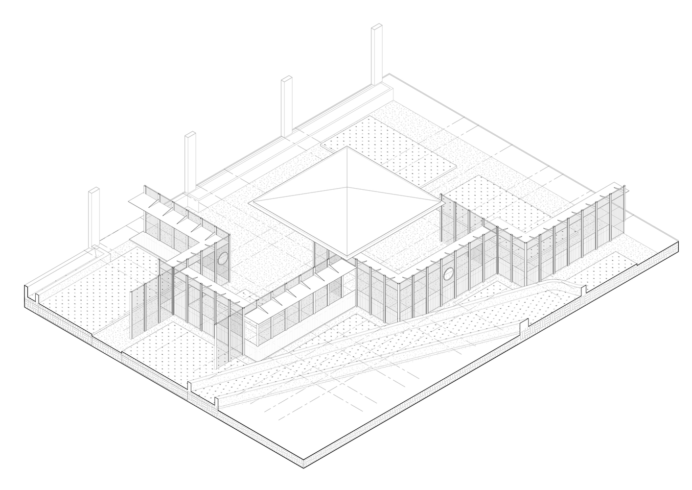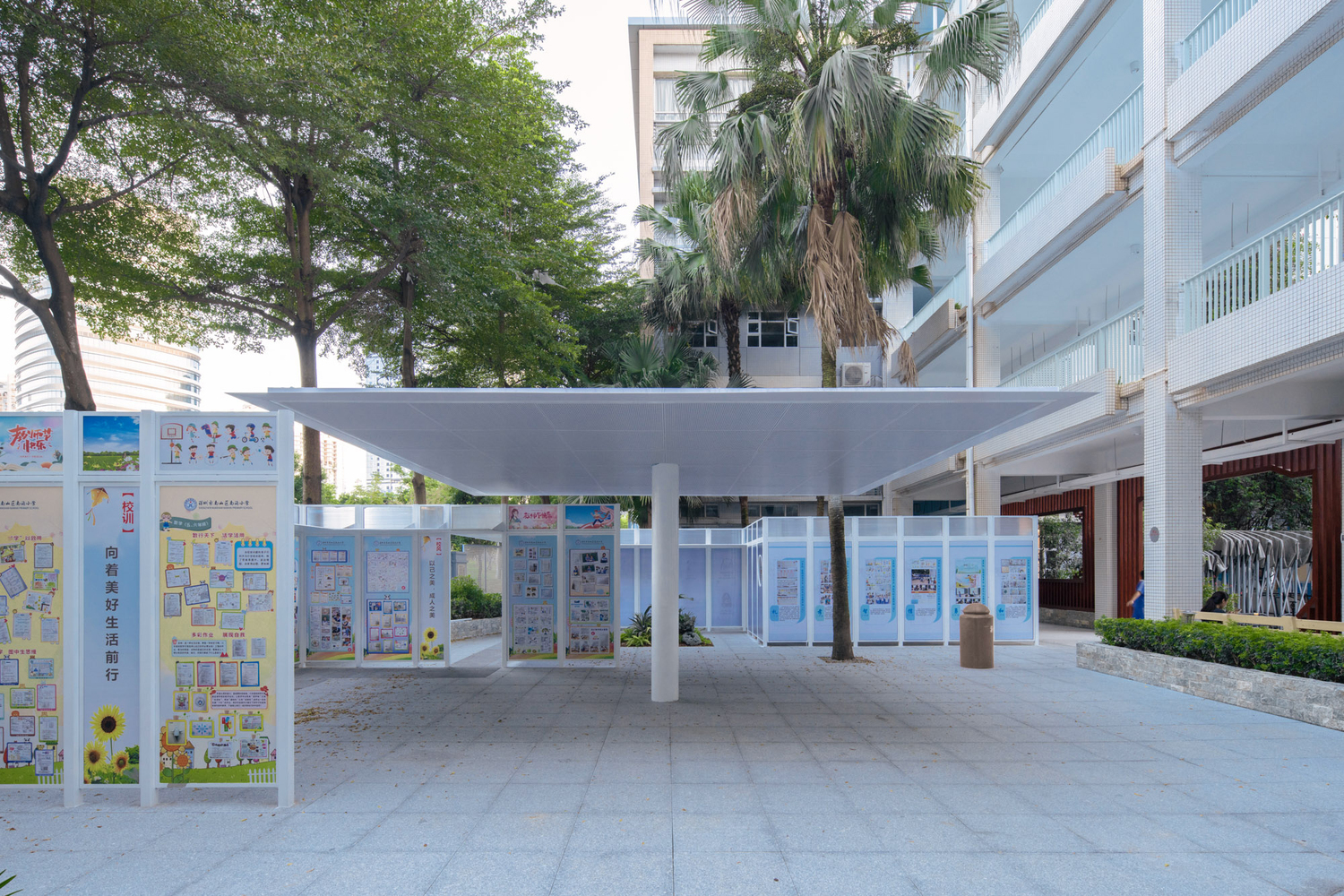 The pavilion and folding-corridor courtyard spaces between the main building and the flower pond were designed as multifunctional areas for school exhibitions and social gatherings. The folding walls and roof structures formed a dynamic, playful space that allowed students to explore and interact with their environment. The single-column pavilion with its cantilevered roof was carefully designed to complement the spatial relationships between the various elements of the school’s architecture, ensuring a harmonious blend of form and function.