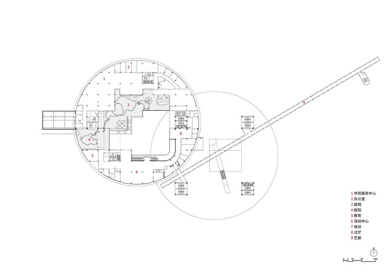 The lower circle houses essential services such as public affairs, children’s science education, art exhibits, and creative workshops, while the upper level contains the Urban Planning Exhibition Hall, elevated via an impressive 16-meter-high escalator. This layered approach ensures spatial variety and vertical zoning of public and cultural functions.