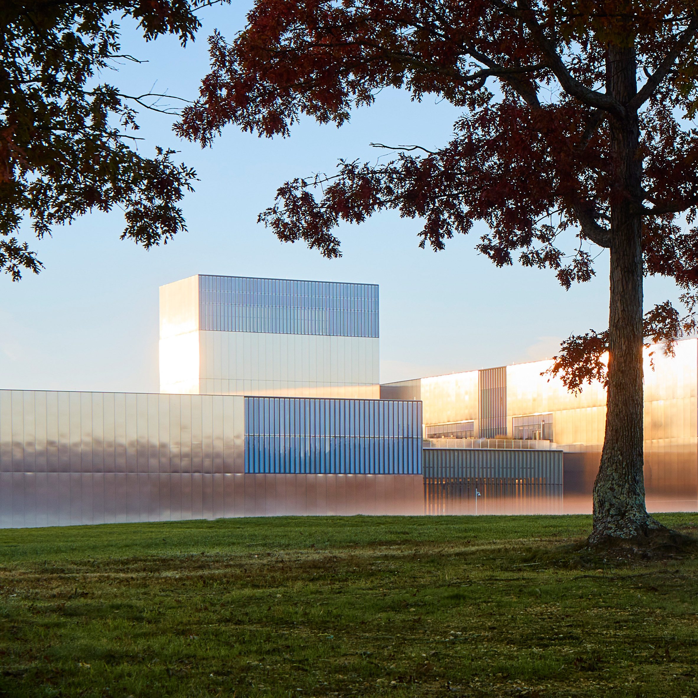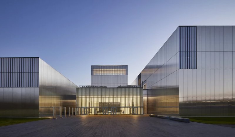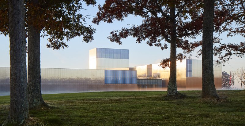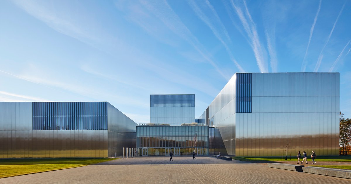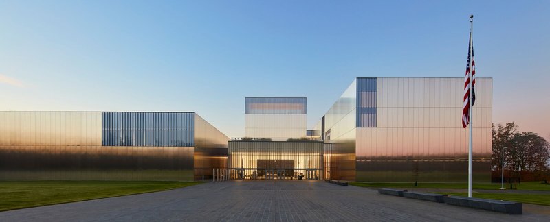 The approach to the museum is intentionally ceremonial. A winding access road reveals glimpses of the stainless steel-clad facade through trees and across open meadows, gradually building anticipation. Rising 100 feet at its peak, the building’s exterior is defined by a disciplined grid of laser-cut stainless steel panels. This precise system reflects the rigor and order synonymous with military service.