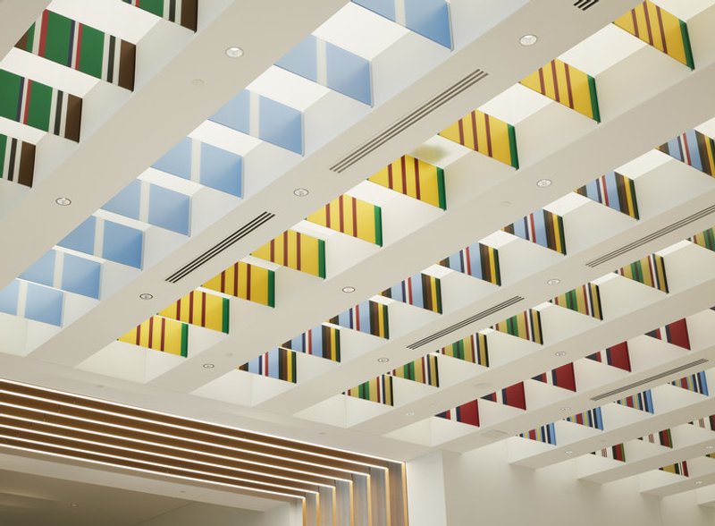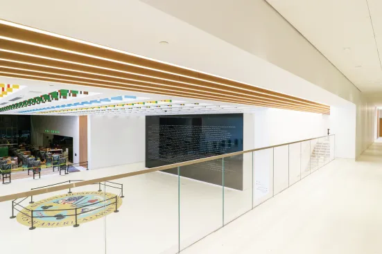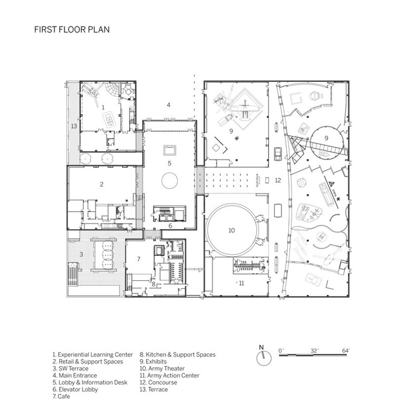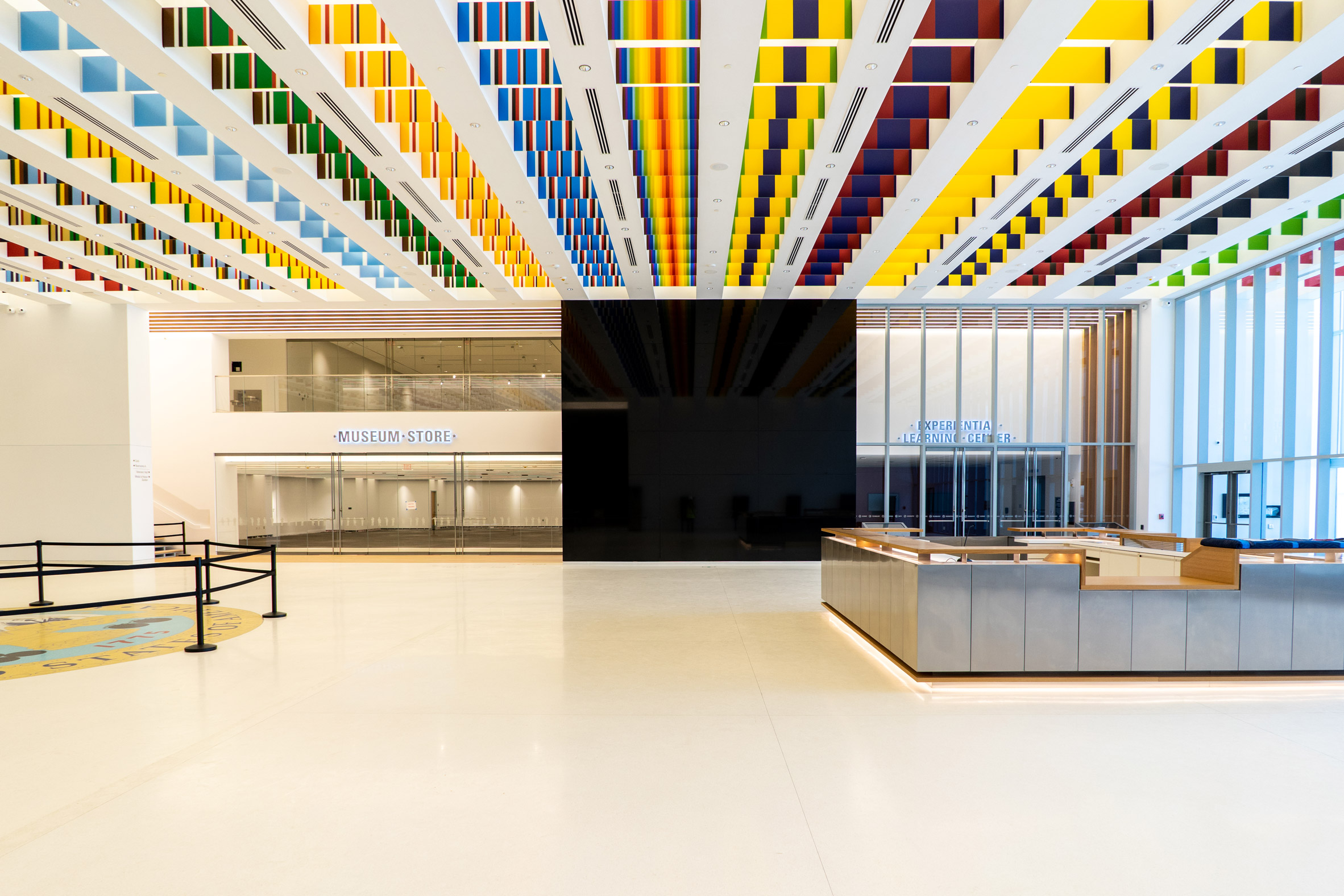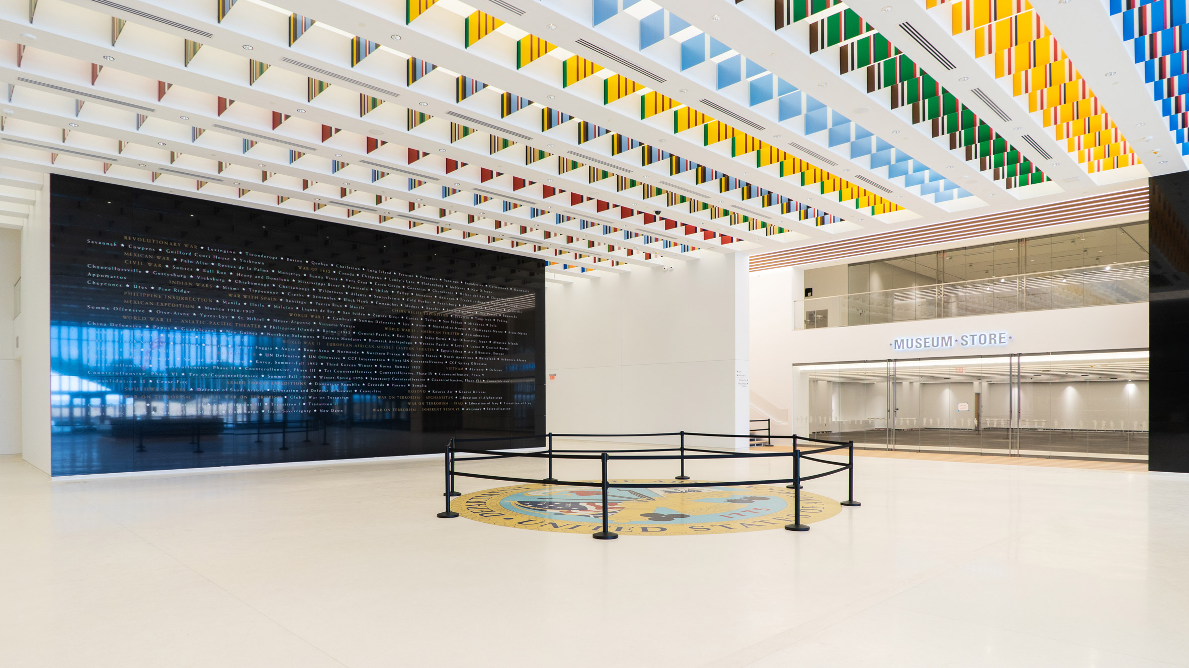 Above, a coffered ceiling of 22 rows of translucent laminated glass panels reflects the colors of historic campaign streamers, symbolically honoring generations of service members. Surrounding the lobby are retail areas, a café, landscaped terraces, exhibition galleries, and a 300-degree immersive theater. A monumental staircase leads to additional galleries on the second level.