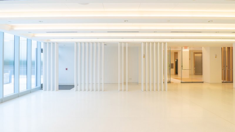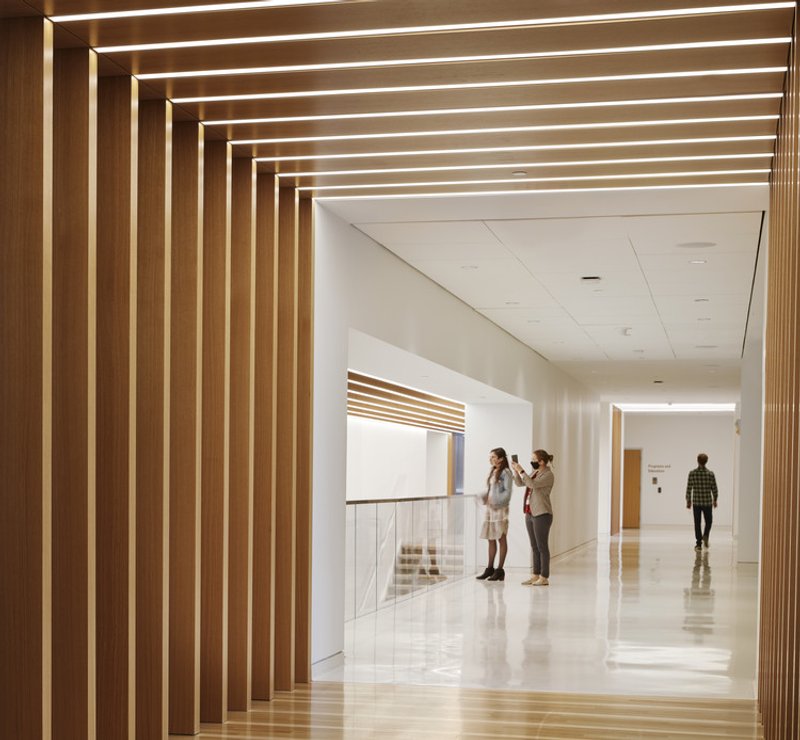 The reflective facade transforms throughout the day and across seasons, mirroring Virginia’s landscape and conveying optimism. Recessed glass panels and painted aluminum fins animate the pavilion corners, introducing rhythm and depth. Built on a strict three-foot grid, every joint aligns with meticulous precision—an architectural embodiment of discipline and unity.