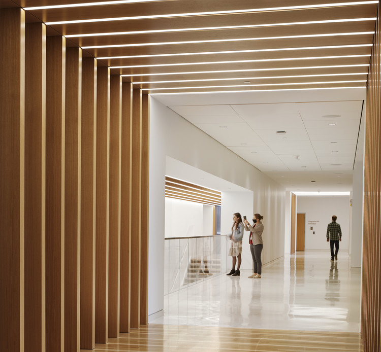 Natural materials—including stone flooring, American white oak, and ash finishes—introduce warmth and tactility. Glass and wood thresholds frame transitions between pavilions while visually reconnecting visitors with the surrounding landscape.