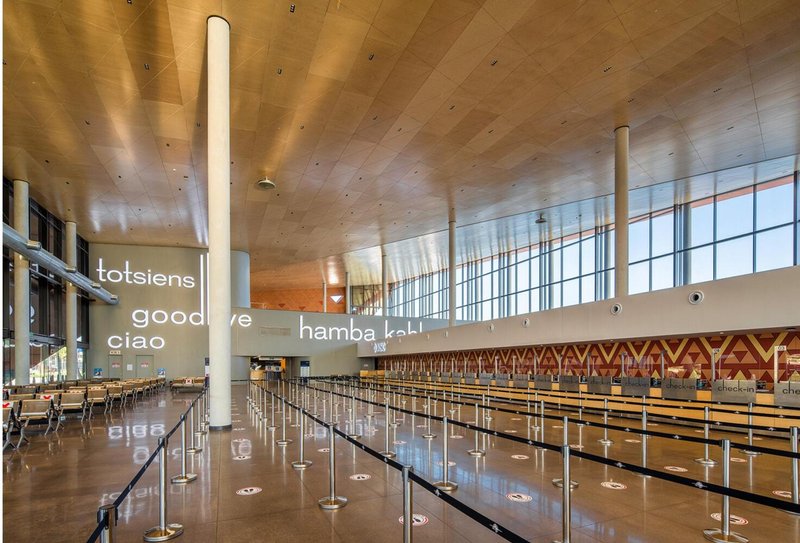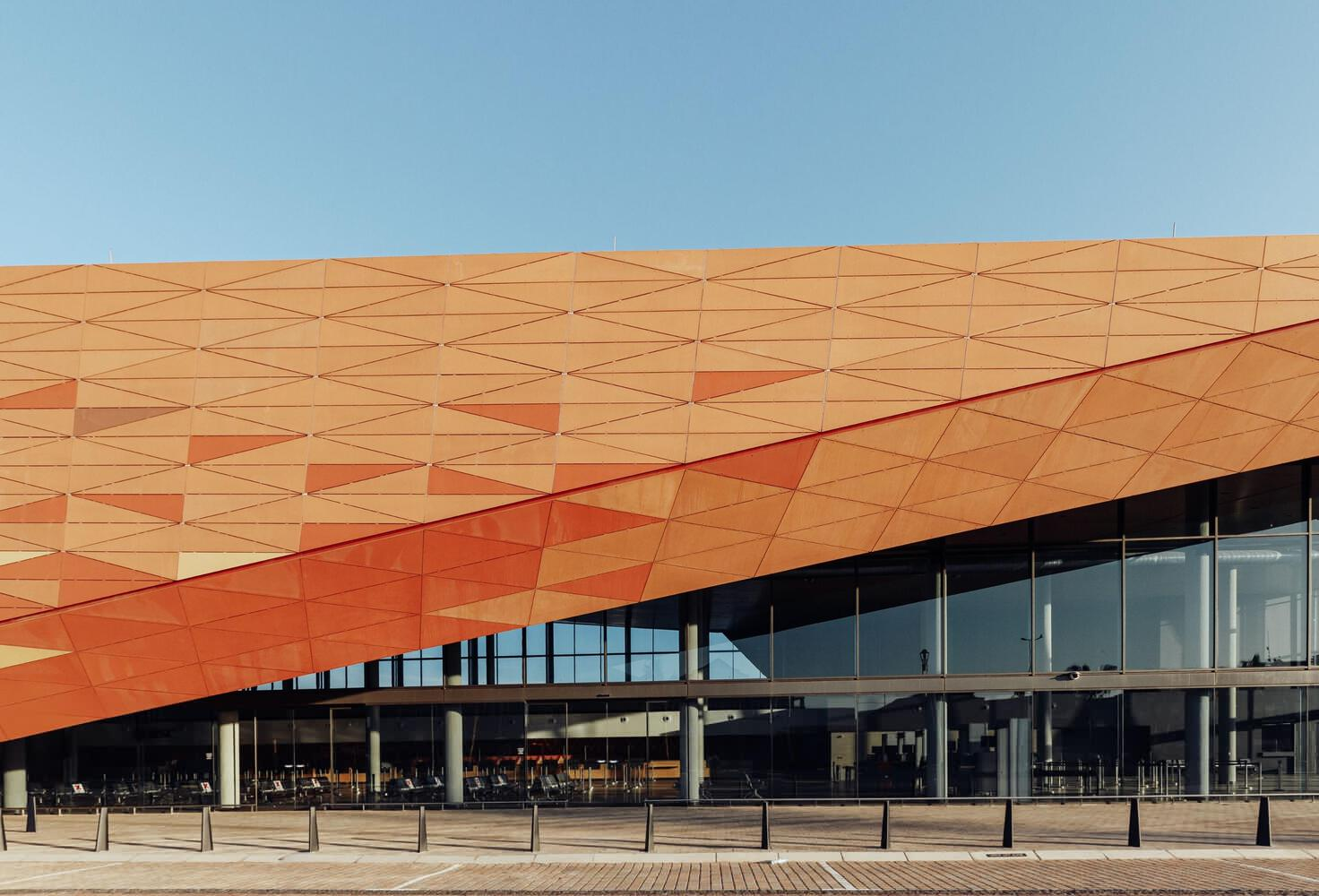 The terminal’s expansive shed-like structure posed significant engineering challenges. The envelope is formed using a 1.2-meter-deep primary steel structural zone clad with profiled aluminum sheeting, enabling an extraordinary long cantilever supported at a single springing point. This technical solution extends to vertical and slightly inclined horizontal planes, creating a dramatic visual language while maintaining structural integrity. The “African grid” of structural columns supports a vast canopy that defines an expansive public piazza, emphasizing the terminal’s bold overhangs and dynamic form.