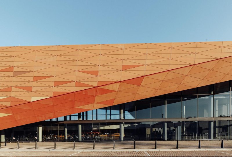 Dwarfed by docked cruise liners, the terminal asserts a powerful presence through its bold, sculptural form, bridging the city and the harbor. Its design draws heavily from Zulu cultural motifs, integrating earthy tones, vibrant textures, and traditional triangular patterns into a visually compelling architectural envelope. The resulting African-inspired façade breaks away from the neutral palettes typical of transportation architecture worldwide, creating a unique and contextually significant identity.