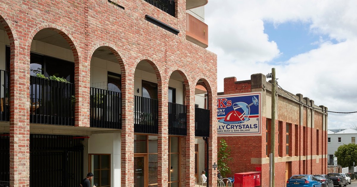 The design of Nightingale Ballarat is a contemporary response to the city’s 19th-century architectural fabric. The arched red-brick façade—made from locally salvaged bricks—echoes Ballarat’s boom-era aesthetic while complementing its neighboring heritage buildings.
