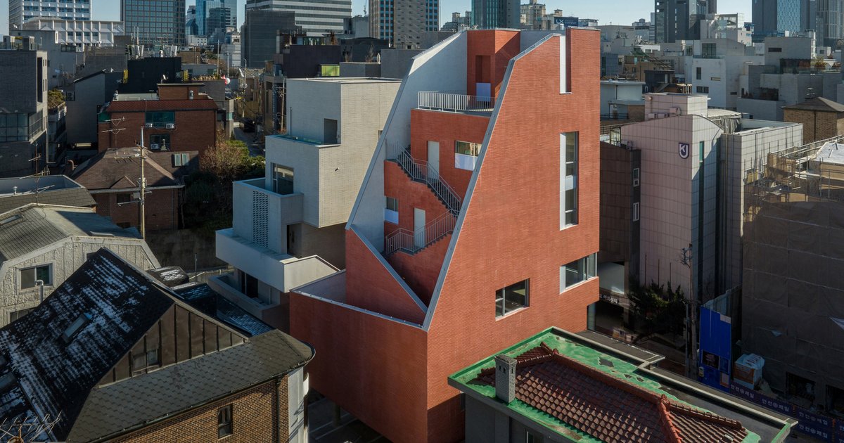 The Nonhyeon 73 Commercial Building in Gangnam features asymmetrical brick façades, external staircases, panoramic views, and maximized retail space efficiency.