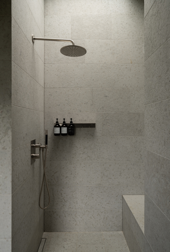 Inside, the home exudes a tactile serenity. Pale timber, soft grey limestone, and finely detailed finishes create a calm environment that mirrors the rhythm of the outdoors. Generous daylight filters through glazed openings, reinforcing a constant dialogue with the surrounding forest and sea. The bathroom, clad entirely in stone with a built-in bench and rain shower, becomes a private sanctuary of stillness and retreat.