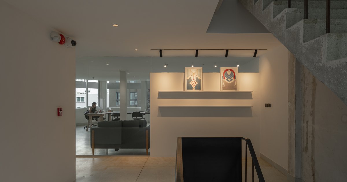 The gallery is organized into two primary zones. The southern side, facing the main road, houses the principal functions such as exhibition spaces, a private viewing room, and offices. The northern side retains the original staircase and accommodates circulation and service areas. This clear zoning enhances functionality while respecting the building’s original layout.