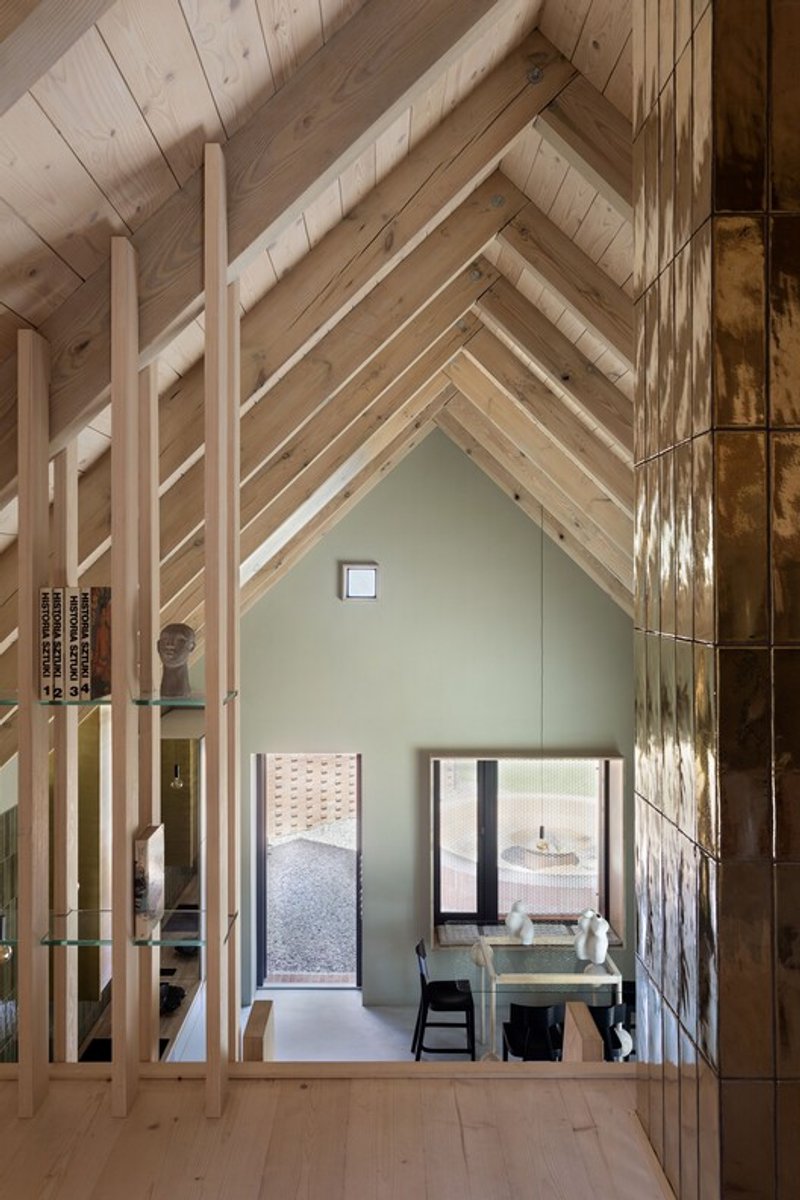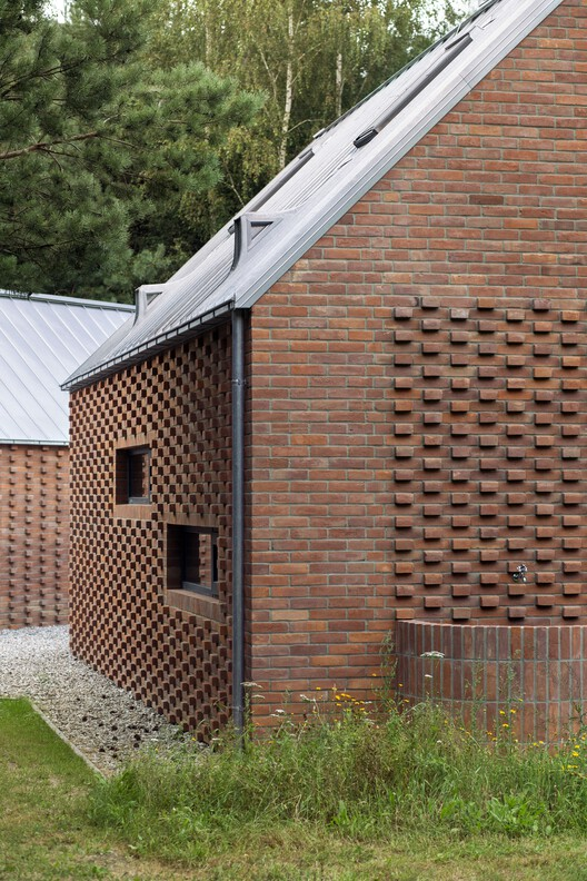 The pinewood structure visually extends the surrounding forest into the interior, creating continuity between inside and outside. Meanwhile, the brick façade incorporates subtle ornamentation inspired by Kashubian embroidery, music, and folk traditions — offering a modern reinterpretation of heritage detailing.