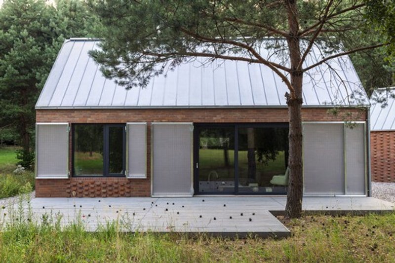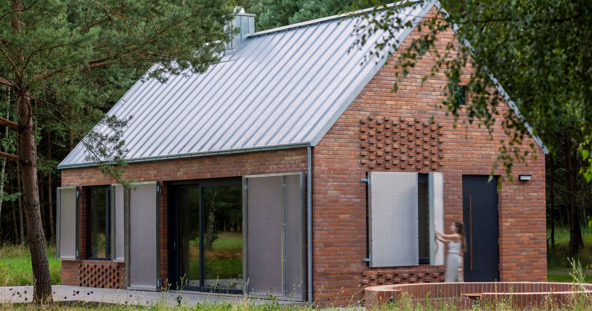 Compact forest retreat in Poland blending Kashubian vernacular, pinewood structure, brick craftsmanship, and zinc roofing within cultivated woodland landscape.