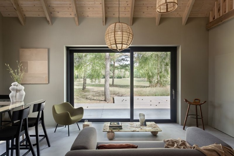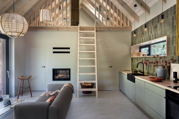 Large windows open to curated forest vistas, balancing inward intimacy with outward openness. The interior palette reflects the surrounding pines through muted greens and glazed ceramic tiles in the kitchen and bathroom, strengthening the dialogue between architecture and landscape.