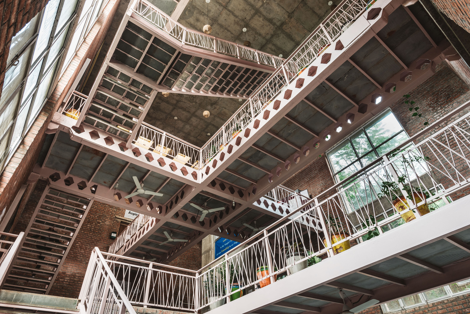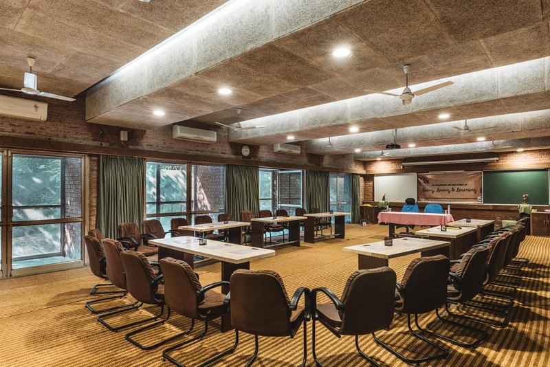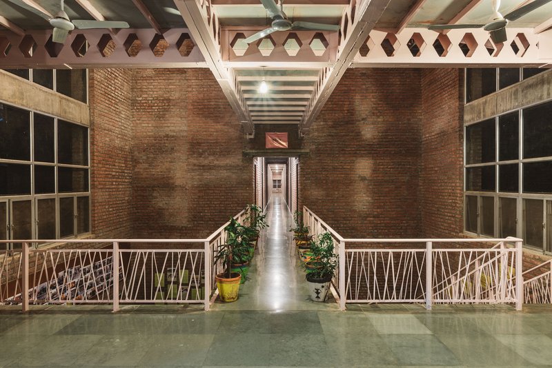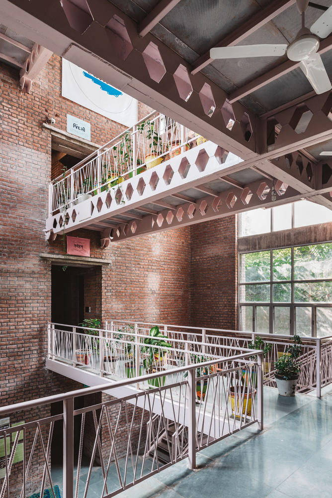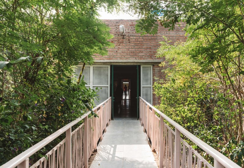 One of the first steps in creating this sustainable campus was the plantation of over 5,000 trees on previously barren land. The material palette was carefully selected to maintain honesty in design—featuring exposed concrete, clay bricks, and Kotah stone flooring throughout.