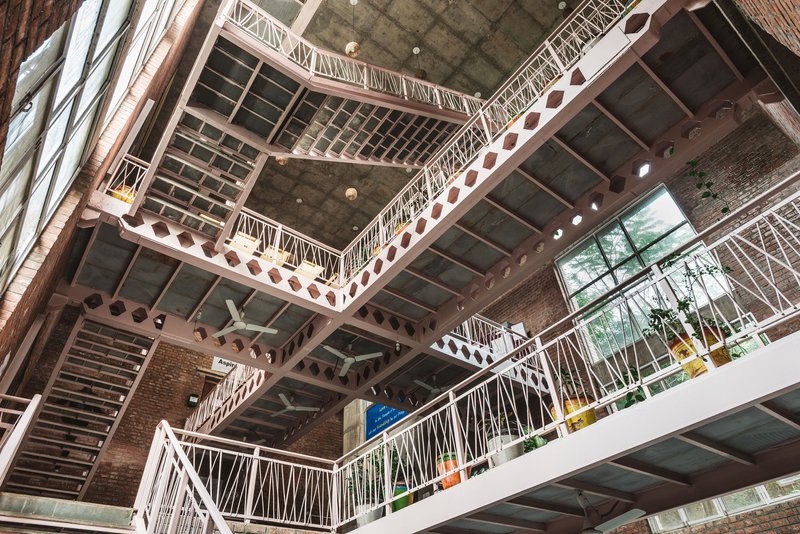 The institute comprises two primary zones—workshop spaces and residential accommodations—connected by a striking five-story atrium. The atrium serves as a vibrant social hub, featuring suspended bridges and open landings, fostering interaction and community engagement. Visitors enter from the top floor, offering an unconventional yet thought-provoking spatial experience—aligning with the institute’s core values of paradigm shift and transformative education.