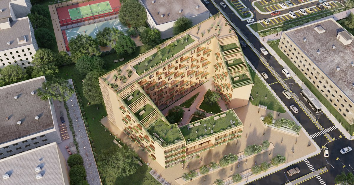 Oblique Ville caters to a diverse section of the rapidly expanding population; a true vertical village that will house around 200 people. These modular dwellings made out of CLT, aim to house the young professionals attracted to the city The pressure to expand faster with more high-density, low-individuality housing is undisputed. Apartments ranging from 36 sq. metres to 72 sq. metres are mixed together, a diversity enabled by the building’s mountainous form and the shifting floor plates that it generates.
