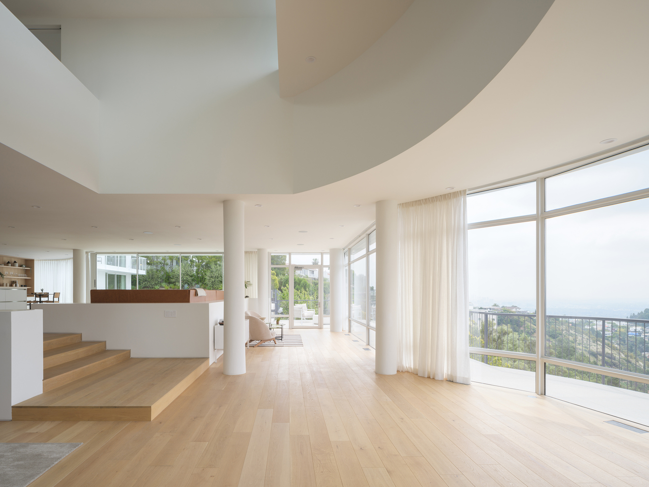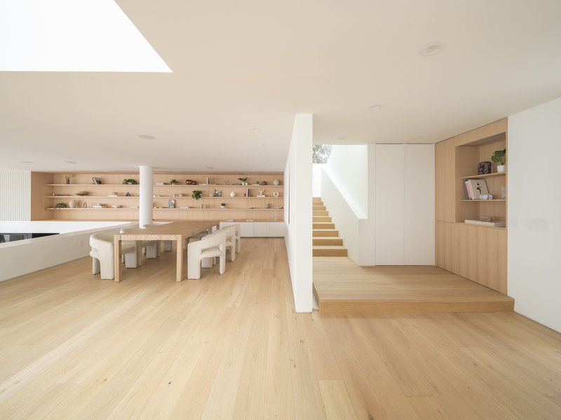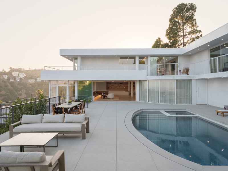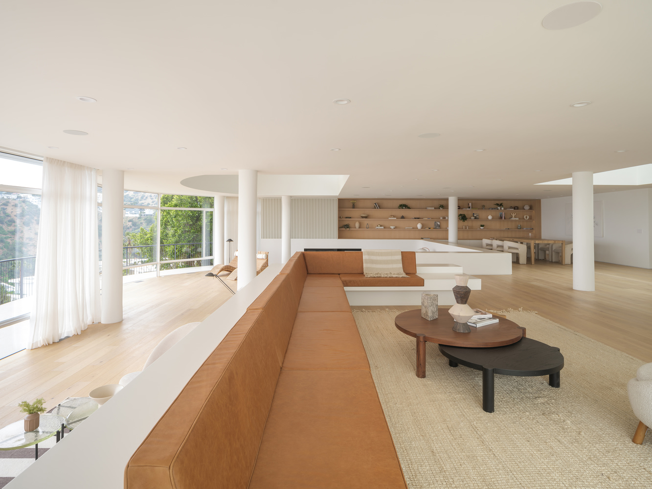 This emphasis on horizontality is paired with a refined interplay between solid masses and open voids. Large expanses of glazing dissolve boundaries, while carefully calibrated planes and projections introduce depth, shadow, and spatial rhythm. The result is an interior environment that feels simultaneously grounded and light, with living spaces oriented toward expansive views of the Pacific Ocean and the Los Angeles skyline.