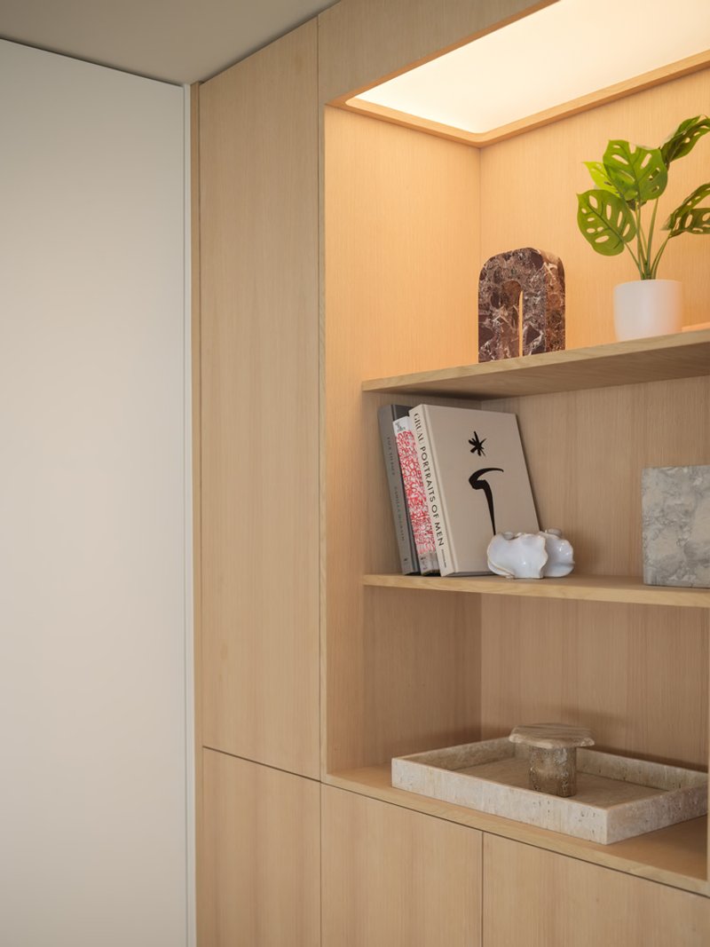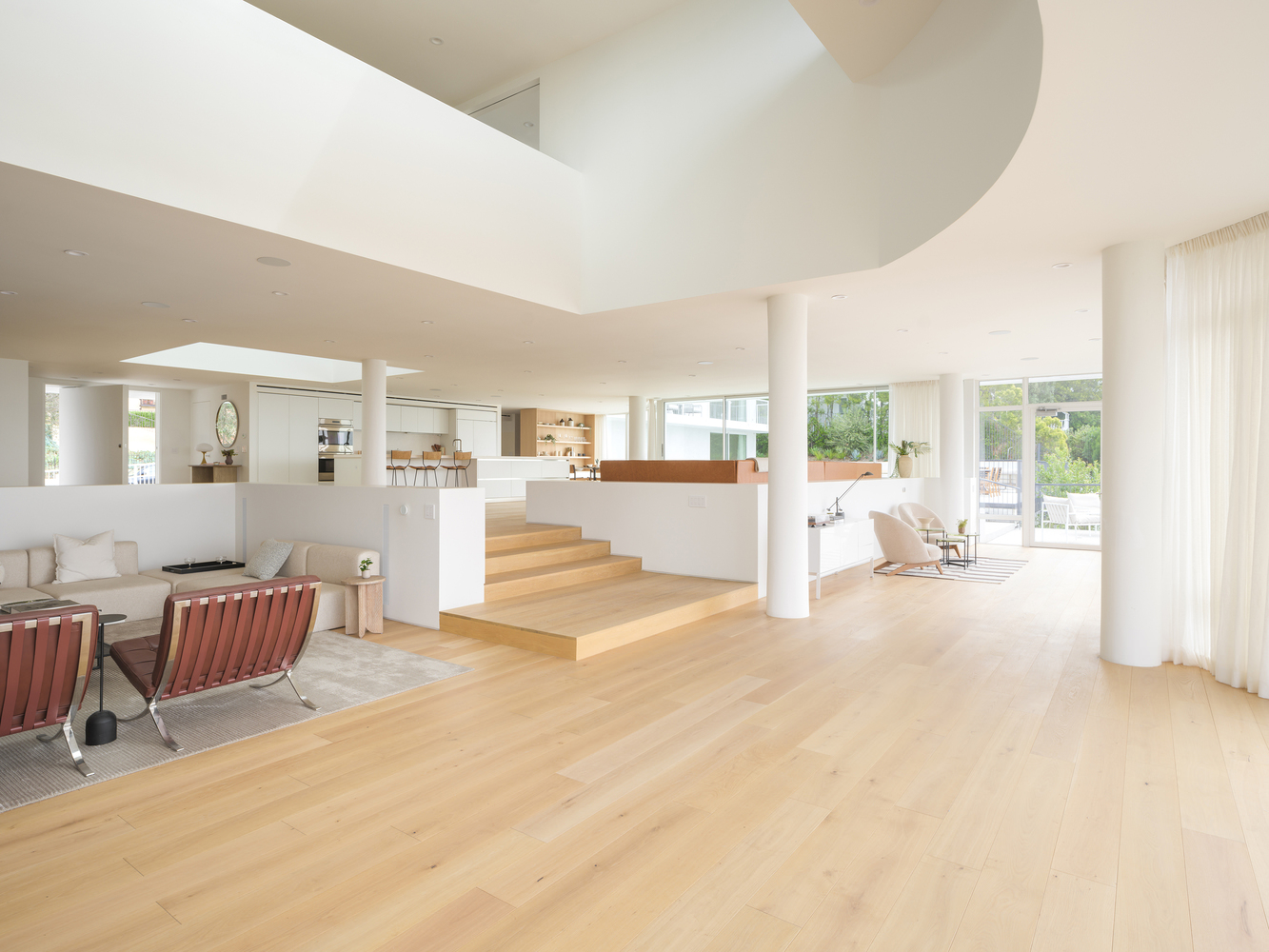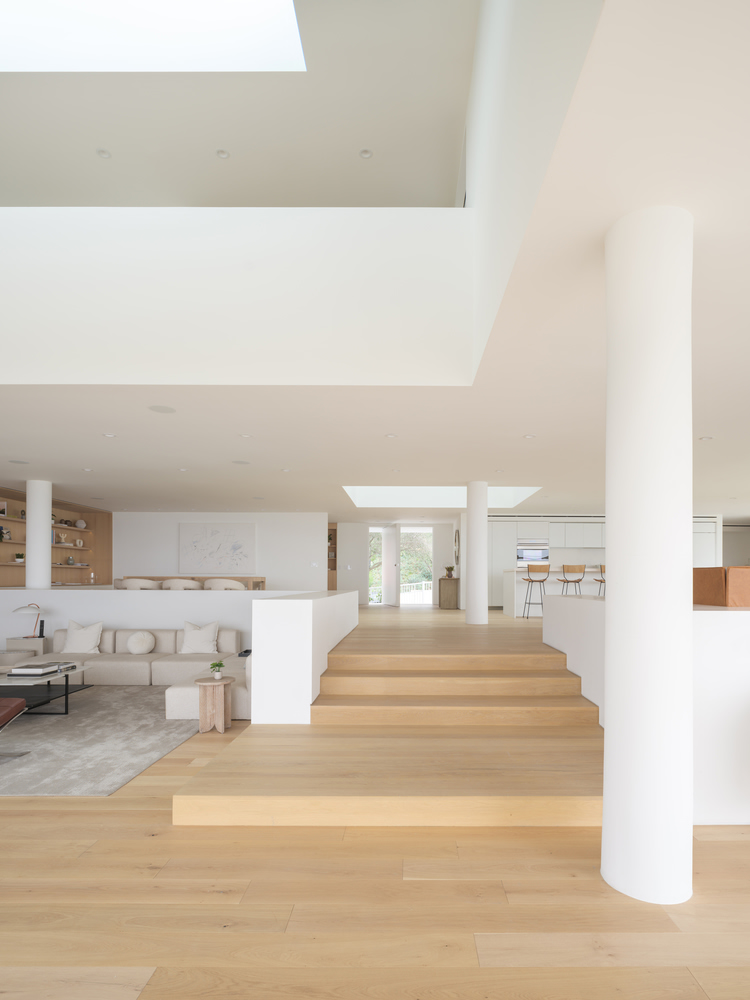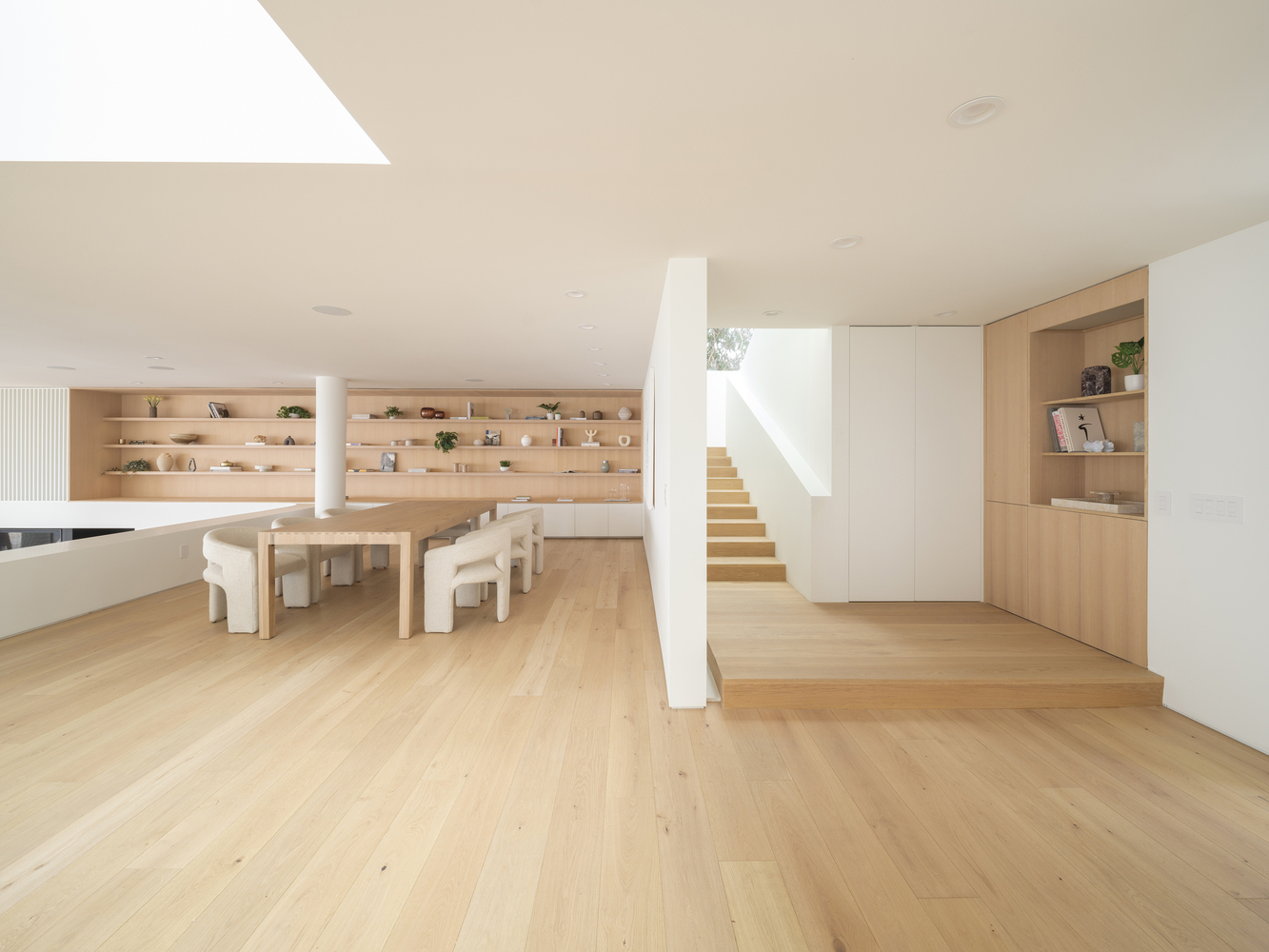 This emphasis on horizontality is paired with a refined interplay between solid masses and open voids. Large expanses of glazing dissolve boundaries, while carefully calibrated planes and projections introduce depth, shadow, and spatial rhythm. The result is an interior environment that feels simultaneously grounded and light, with living spaces oriented toward expansive views of the Pacific Ocean and the Los Angeles skyline.