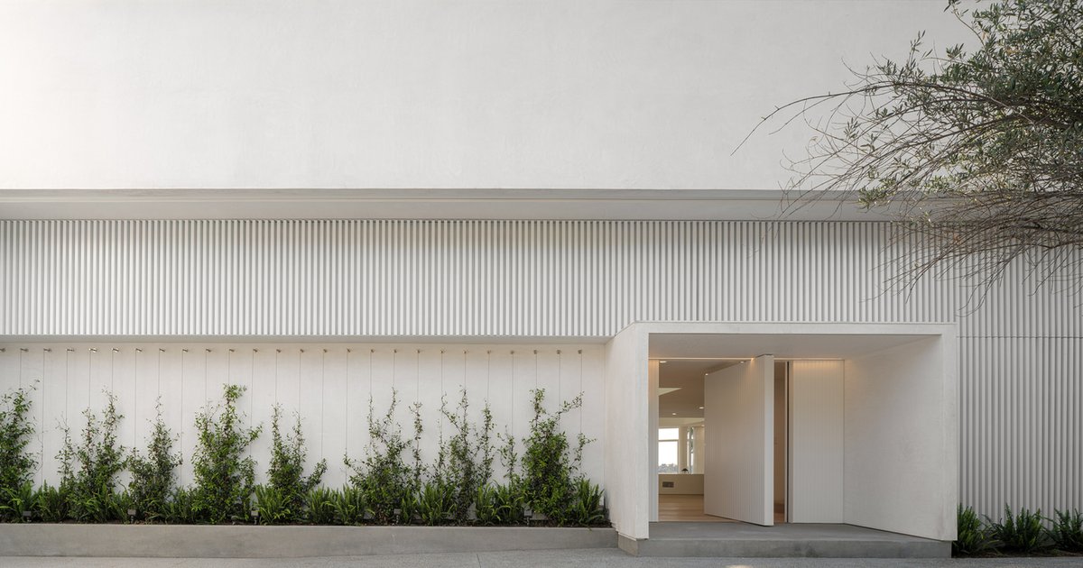 - The middle band of white vertical slats mediates between solidity and openness, enhancing privacy without compromising daylight.