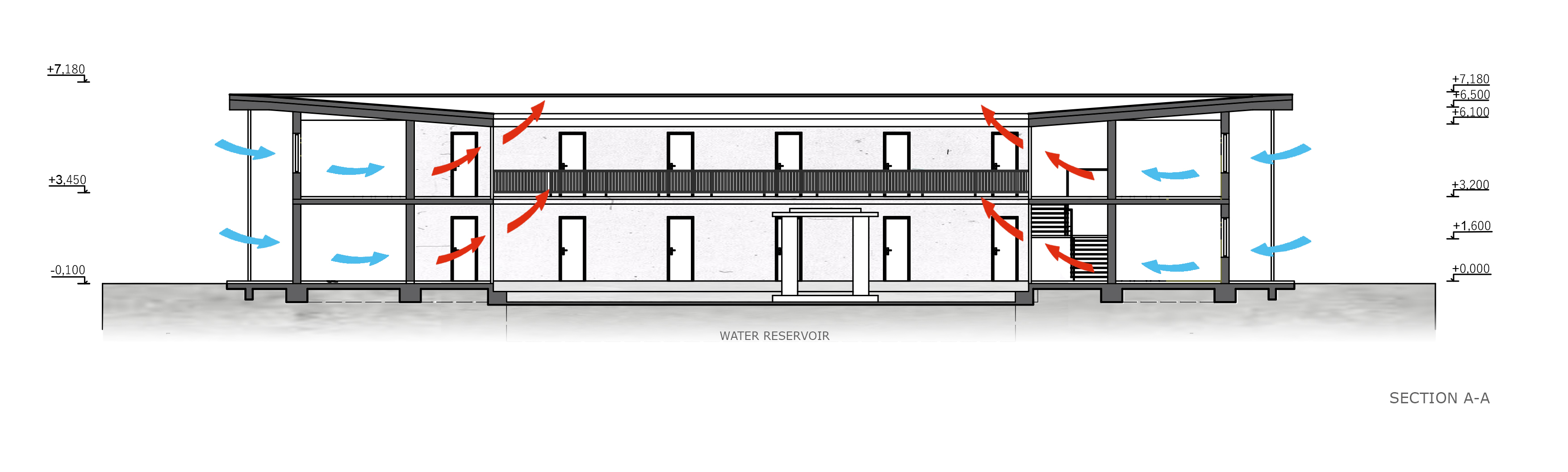 The building has a combined support system, where the structure is supported with walls and columns. The walls are width is 300mm and the dimensions of the columns are 300 x 300mm. The building is in a modular system of 4 x 4m (also the size of the rooms). There are used beams with the height about 350 mm and the reinforced ceiling slab has a thickness of 160mm. Internal height in the building is 2700mm and the construction height is 3200mm. The facade has panels with steel frames that are filled with recycled plastic tapes of different colours. The material used would be methacrylate or alternatively steel chains could be used. Some of them will be fixed and will support the building. The walls and columns are coloured white and in the atrium is tiled and the railings used are wooden.