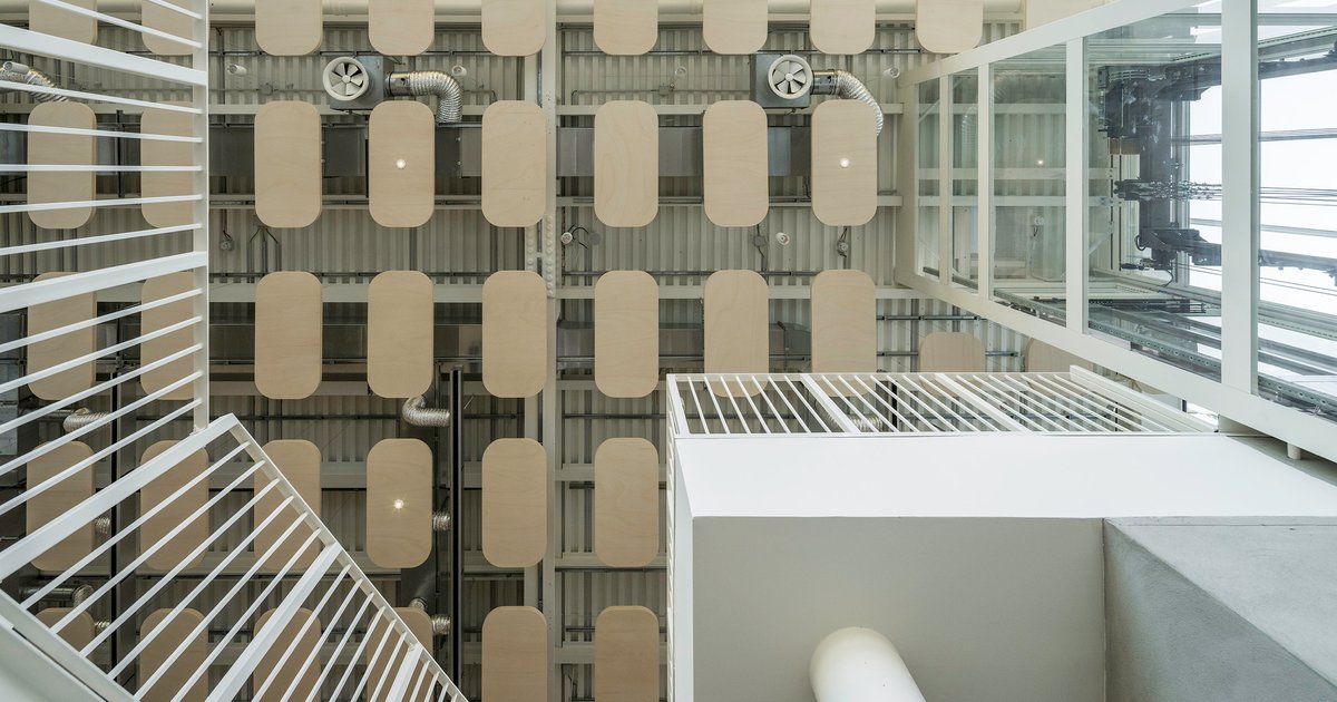 The podium’s metal-rod façade allows natural light to permeate while masking parking areas. Inside, a wooden-finished reception volume anchors a warm, inviting atmosphere, complete with a monumental staircase that doubles as an informal auditorium.