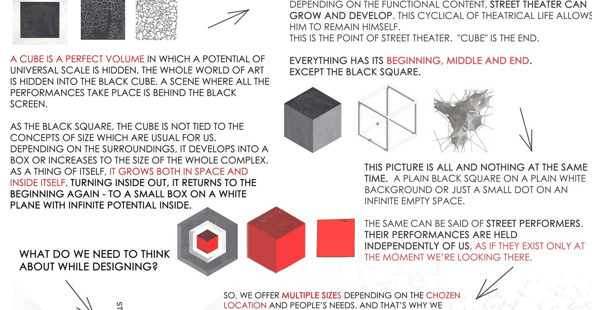 At the center, a defined core acts as the focal point of performance—a contemporary reinterpretation of the stage. This “red cube” becomes both a spatial anchor and a symbolic element, referencing Malevich’s abstract geometry.