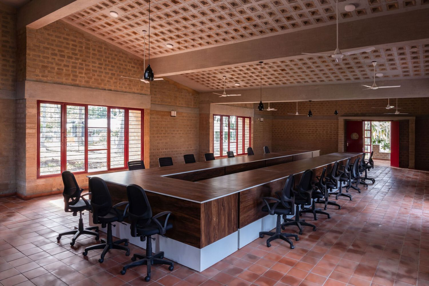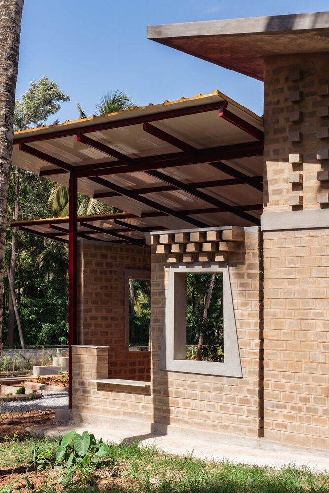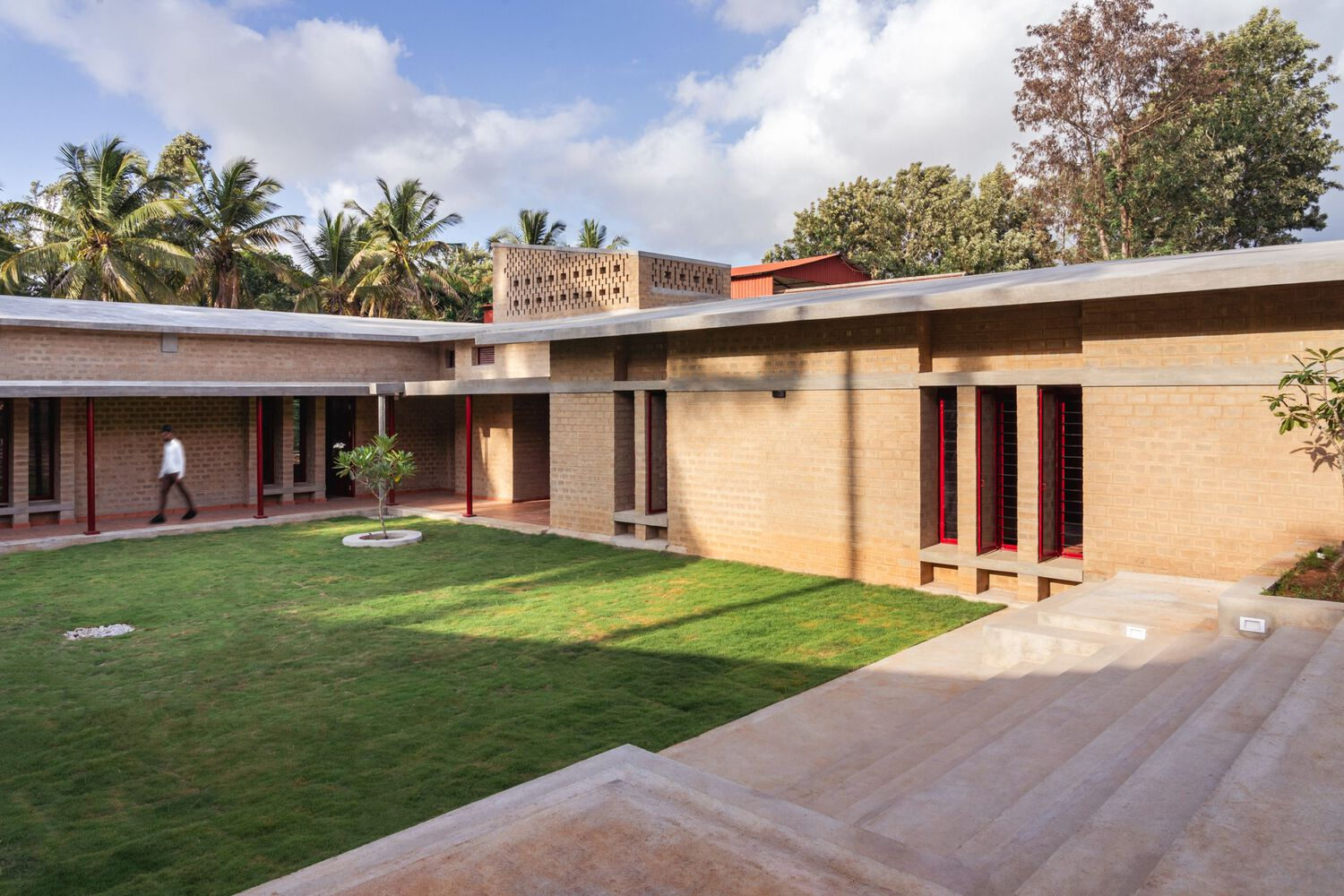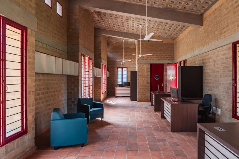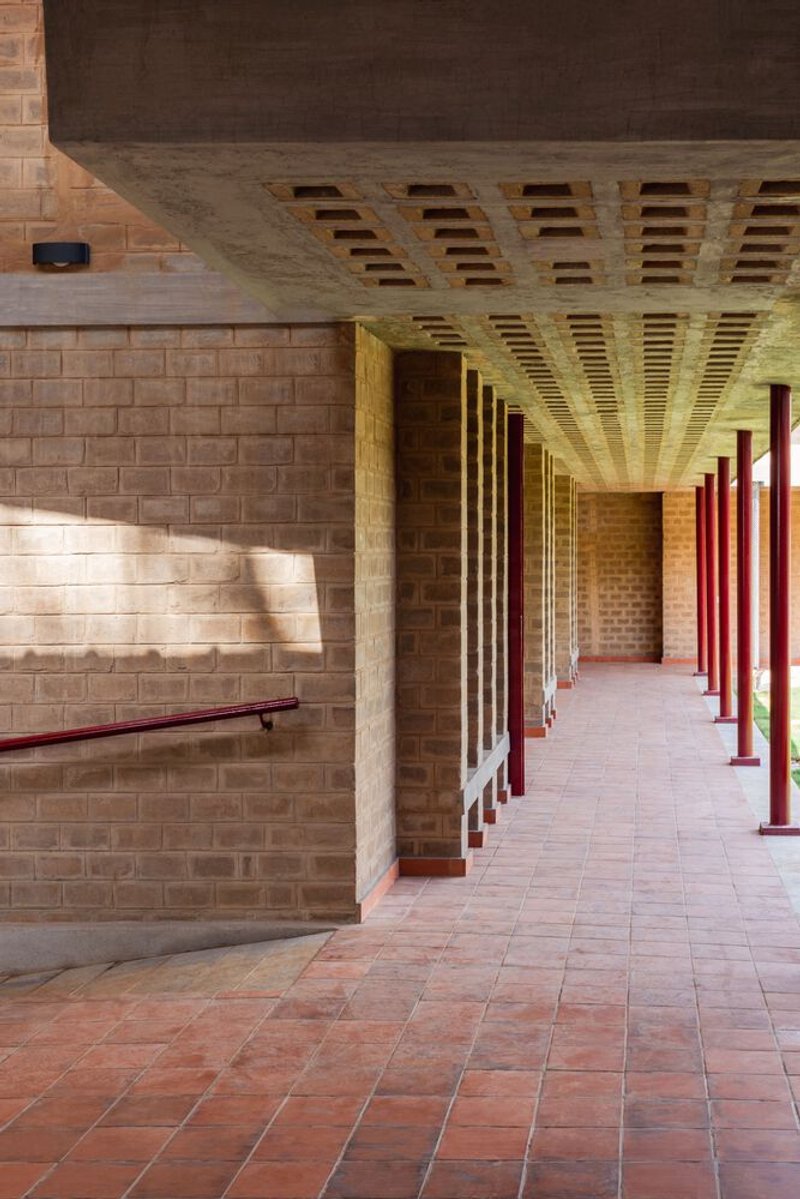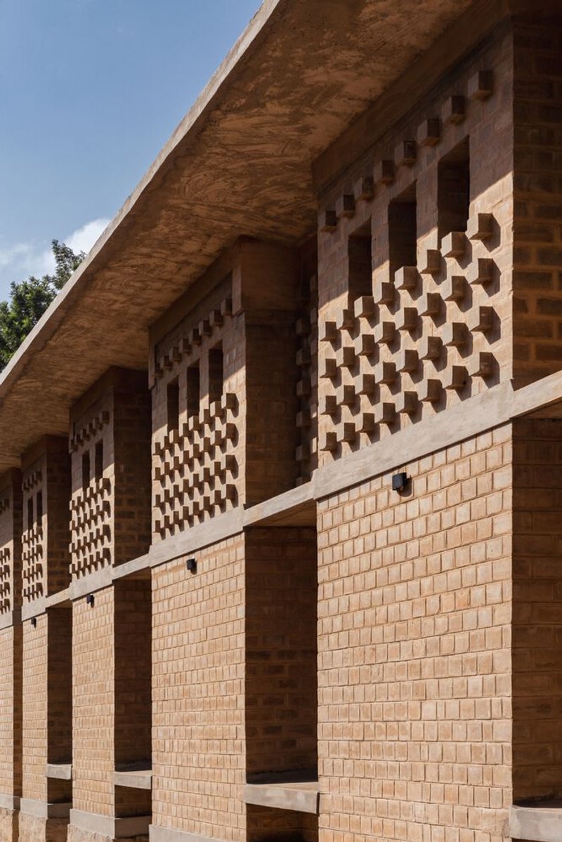 Central to the project’s sustainable design is the use of locally crafted mud bricks, forming the building’s core structure. These sun-dried, mud-stabilized bricks reduce the environmental footprint by minimizing cement and steel usage. Their porous nature enhances natural ventilation, while the stepped brick facades create dynamic patterns of light and shade. This approach not only provides thermal insulation but also introduces tactile textures that enrich the visual experience of the architecture.