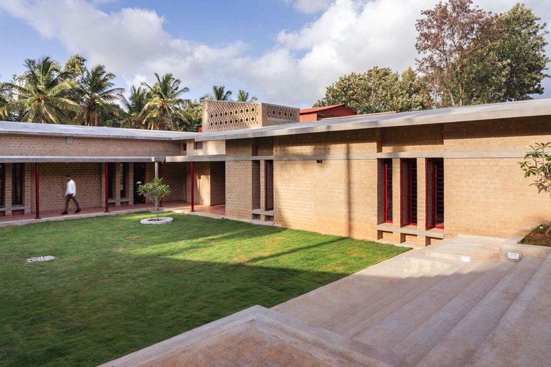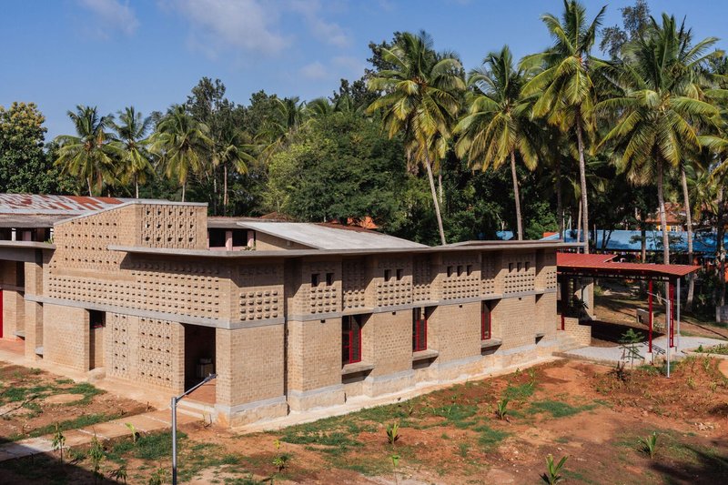 The Organic Research and Training Centre in Bylakuppe uses sustainable mud-brick architecture, courtyards, and rainwater harvesting for organic farming education.