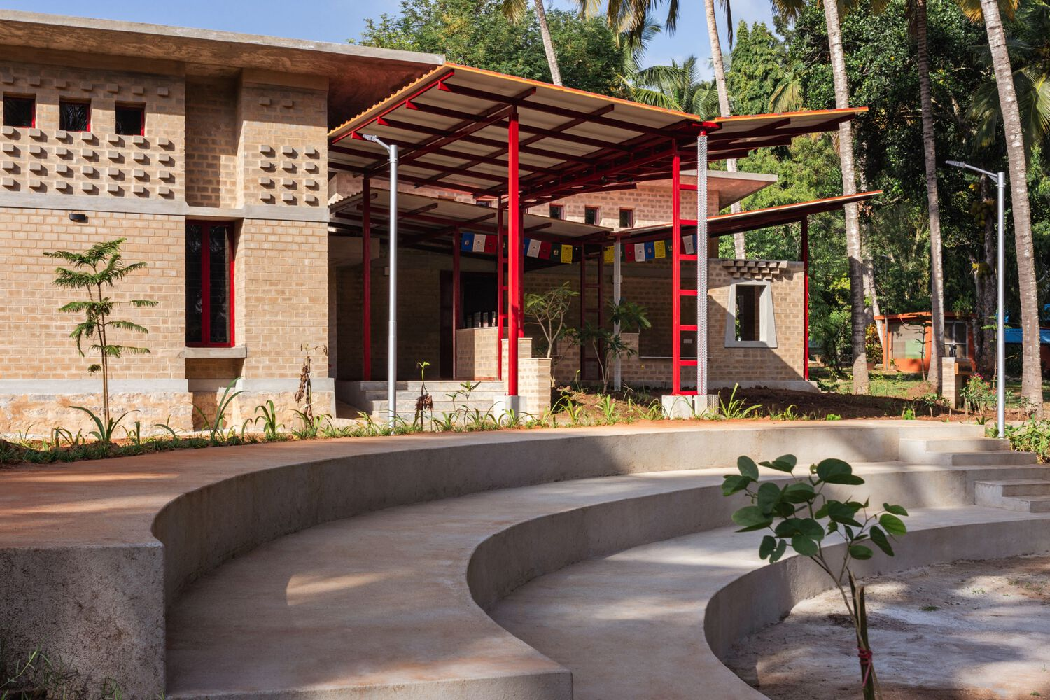 The Centre is organized around a lush internal courtyard, which functions as a natural ventilation system while providing serene green spaces for reflection and collaboration. Verandahs surround the courtyard, encouraging airflow and promoting a sense of community. Adjacent to the main road, an amphitheater set among coconut groves accommodates large events and serves as a gathering space for the broader Tibetan community. Both courtyard and amphitheater allow for communal activities, even when other parts of the building are closed.