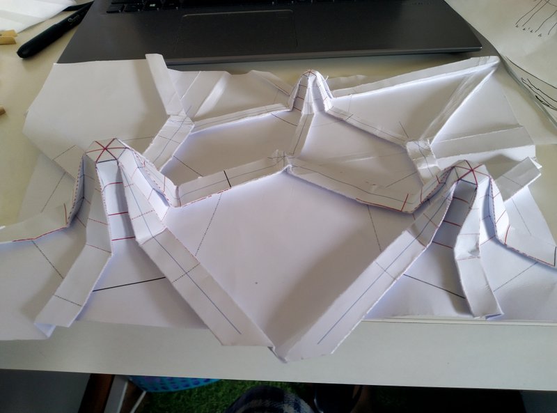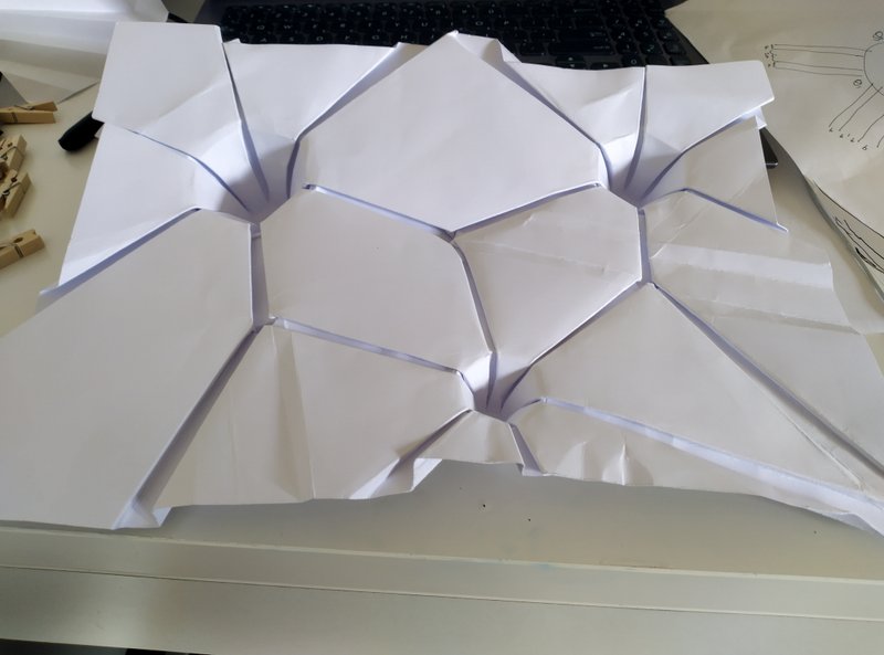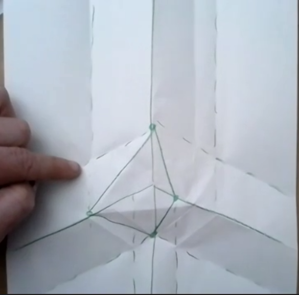 The crease pattern sketch shows the locations of various pleat intersections. Consulting origami artist Benjamin DiLeonardo-Parker for the general mathematical techniques of pleat intersections, we worked out the flat-foldability in our intersections. As a worst case scenario, where three set of pleats intersect they would need to create a fourth pleat.