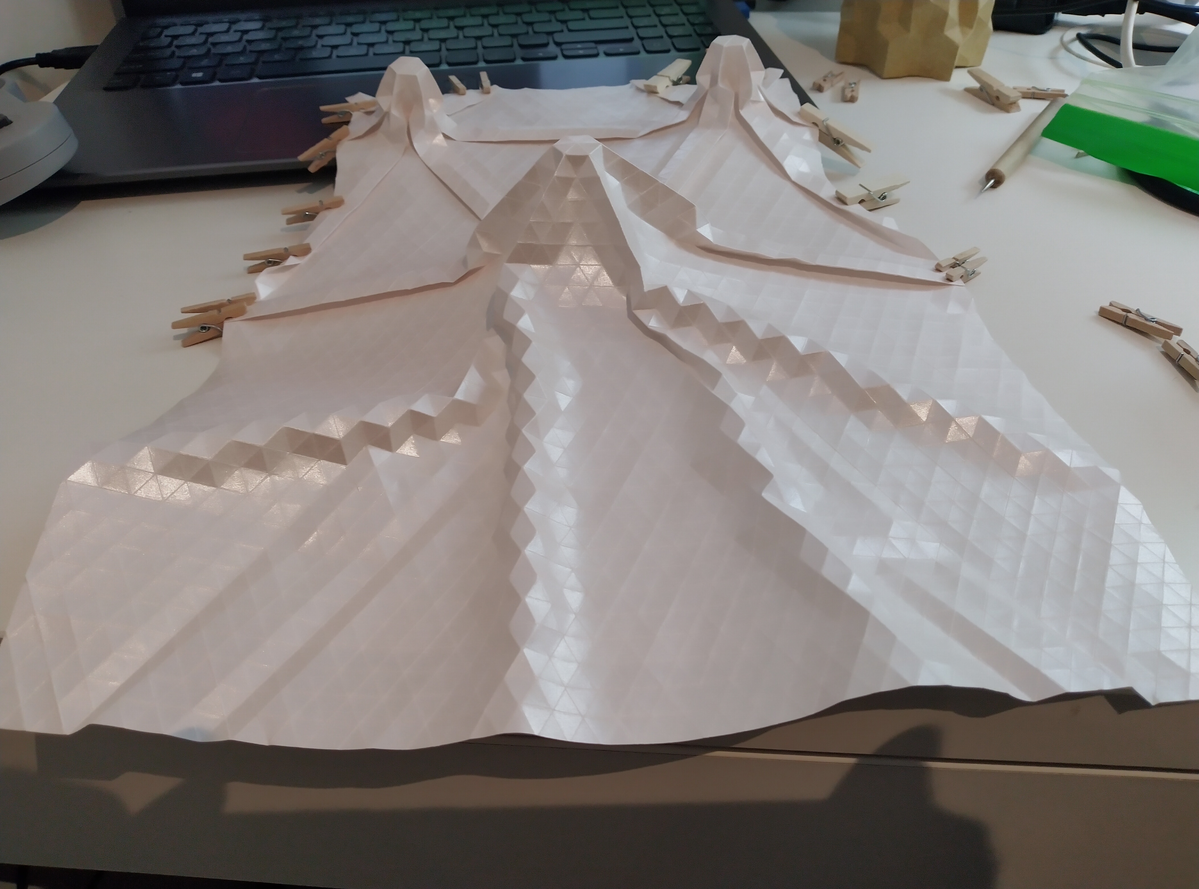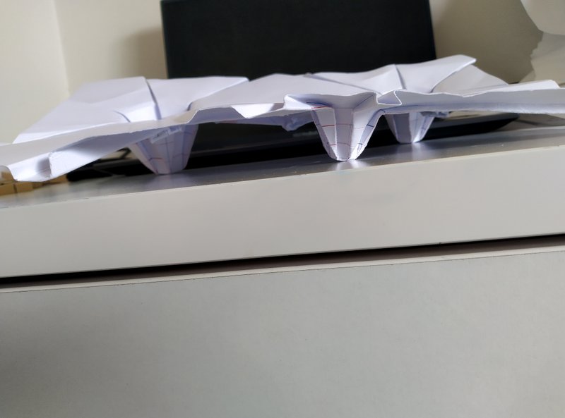 We decided to continue with a single consistent pleat width for all columns, and to finally move away from flat-foldability, towards a freer corrugation upon the underlying grid structure.