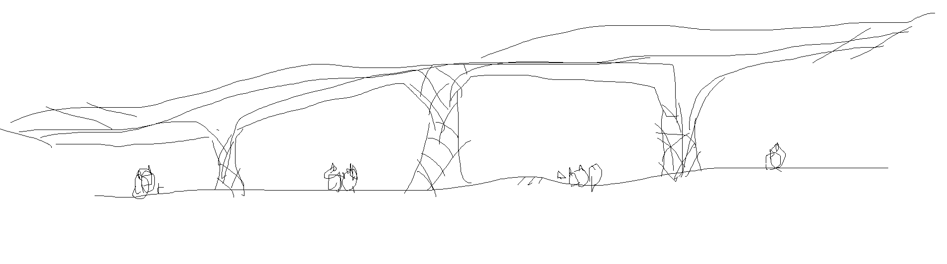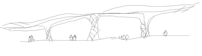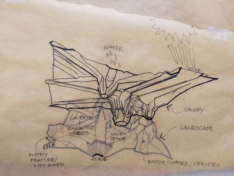 Our first concept involved an expansive roof with variously sized columns.