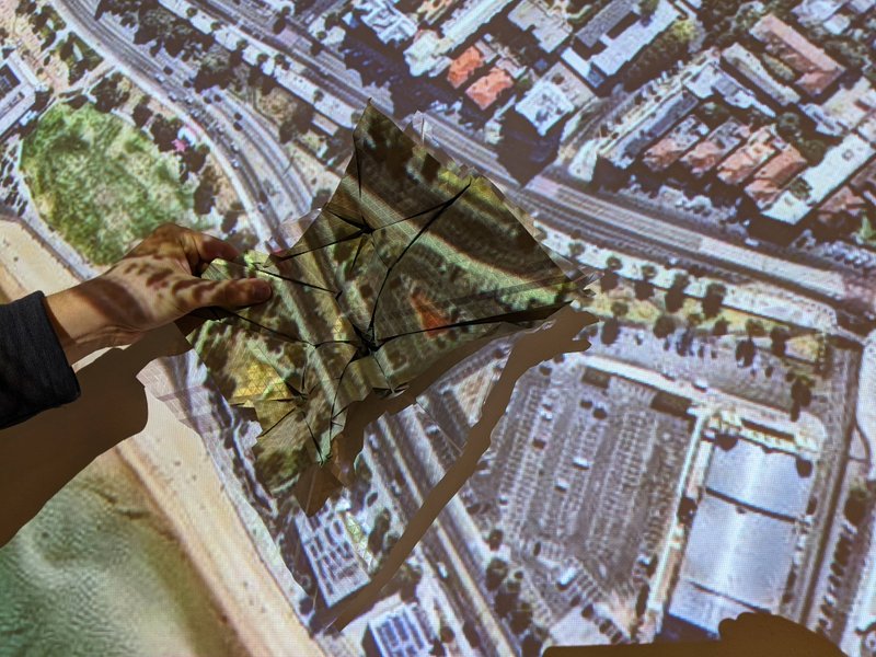 After much discussion, we decided on a site location, at St Kilda Beach in Victoria, Australia. The undulating structure will connect the ocean to the nearby businesses and housing, allowing a road to pass underneath it. We used a projector to work out the scales involved, as well as location, before printing a large copy of the map.