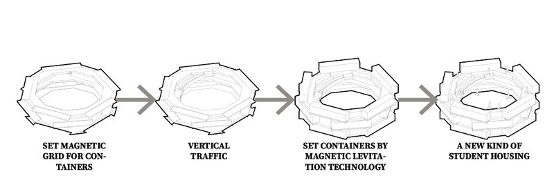 Student dormitories are as important to students as gravity is to architectural design. Therefore, we are exploring all the possibilities of architecture outside the gravity cycle. We are trying to introduce a magnetic levitation container frame system in this design, exploring the possibility of convenient replacement in the future. By doing this, with a large single-row ring, not only in the three-dimensional vertical space, but also in the plane expansion, it will break away from the restriction of the topography, sort out the composition of the block, and become a space for sorting out the community. It will become a symbol in the community. Not only accompanied by different needs, outside the original loop, the building also has extended different branches. Students, even the residents close to this community, now have greater freedom and ample space to explore what they want to do in community life. They are no longer restricted to the cycle., which seems like the same to everyone living in the same block. Their lives are full of more variables and more possibilities, by living in these “outside loop” dormitories.