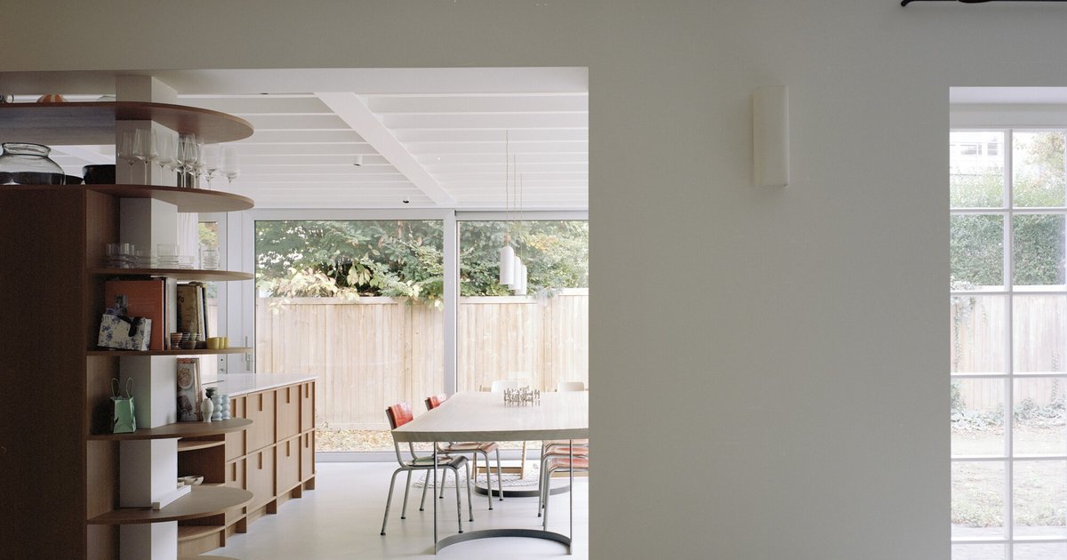 The dining area captures this dual relationship well: a white beamed ceiling holds the interior together overhead, while full-height glazing dissolves the boundary between table and garden. A timber fence provides privacy from neighbors without blocking green views. The architecture works hardest at the seams between inside and out, and these moments are where Crabe Fantôme is most convincing.