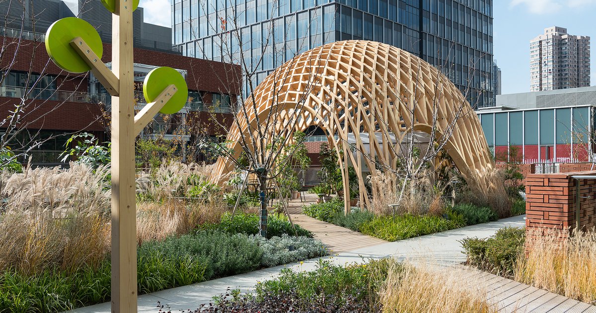 - Sunlit Jungle Café & Eggshell Timber Dome: A biophilic retreat beneath a wooden lattice structure that provides an inviting social space for relaxation.