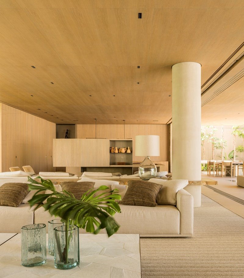 The house features a neutral palette with soft sand tones, complemented by wood and concrete combinations that create a warm, tactile environment.