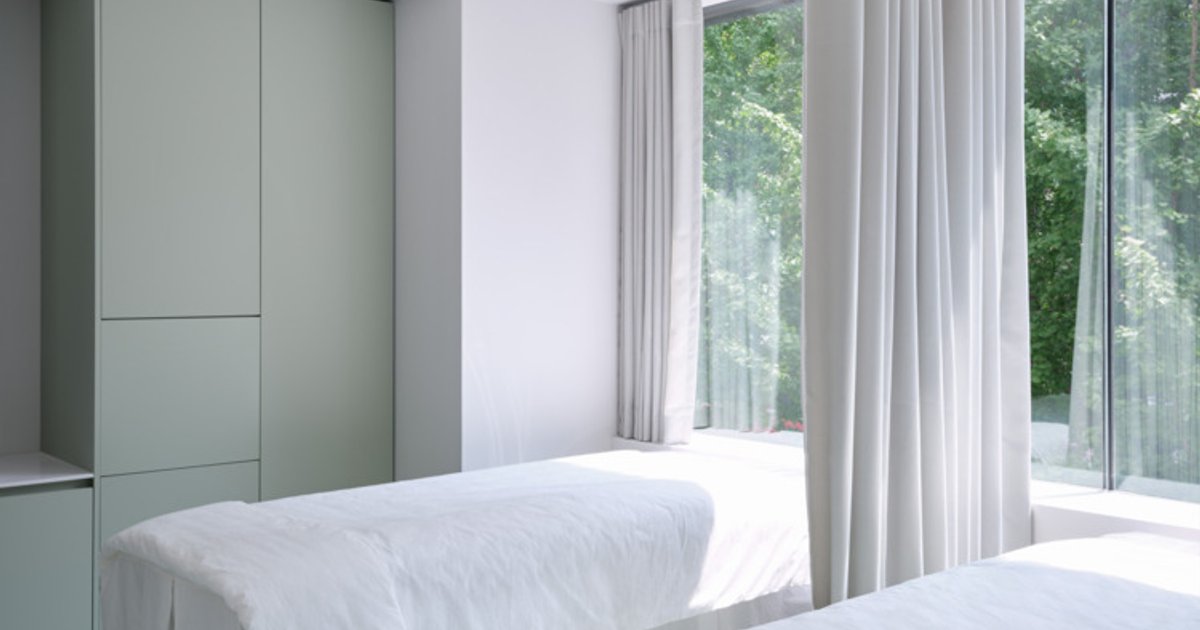 The main treatment room is thoughtfully designed to accommodate one or two clients simultaneously. Instead of rigid partitions, a flowing central curtain allows the room to be unified or divided as needed, fostering privacy without compromising softness. The emphasis on fabric over solid walls reinforces the project’s gentle, calming aesthetic while offering adaptable functionality for varying care sessions.