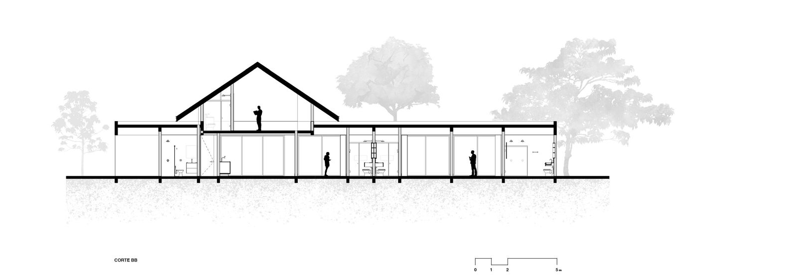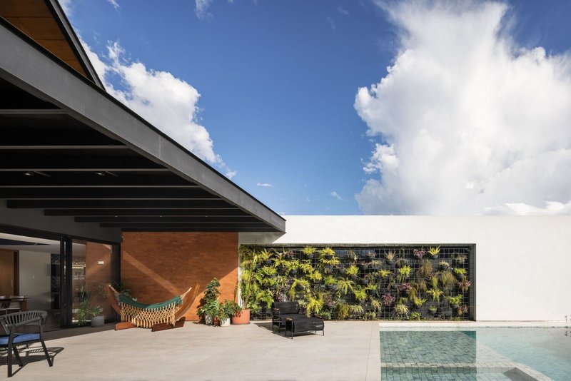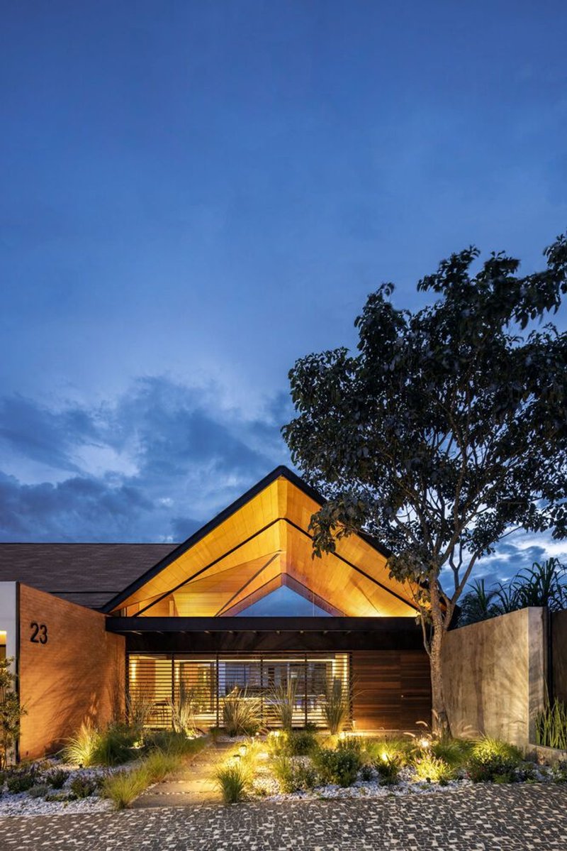 The essence of Papillon House lies in its striking four-water roof, which serves as the focal point of the entire design. This roof, a nod to traditional colonial houses, is complemented by modern materials and techniques, creating a harmonious dialogue between past and present. The use of brick and wooden boards on the ceiling imbues the house with a rustic charm, while the metallic structure and expansive glass closures introduce a sleek, contemporary vibe.