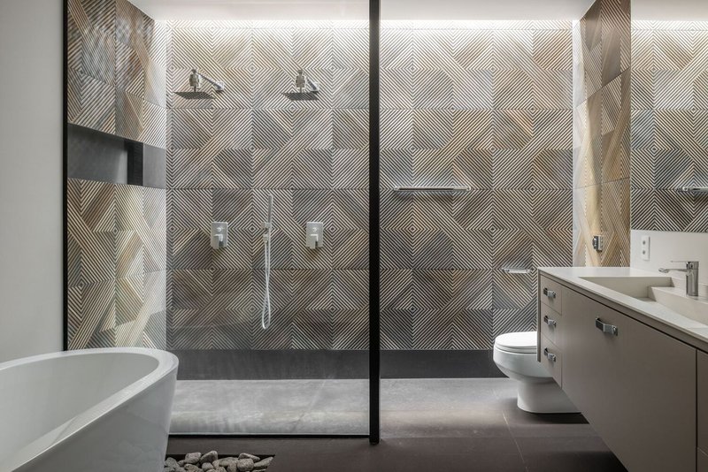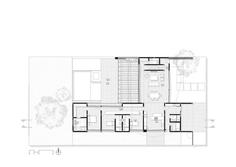 Upon arrival, visitors are greeted by a welcoming entrance garden. This lush space is framed by the house's distinctive roof and horizontal slatted brises, which create a seamless connection between the indoor and outdoor environments. The façade, characterized by its elegant simplicity and thoughtful material choices, sets the tone for the rest of the house.