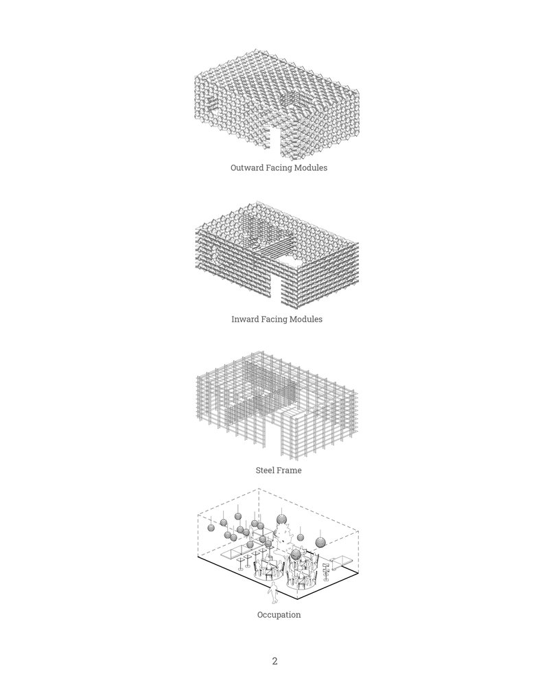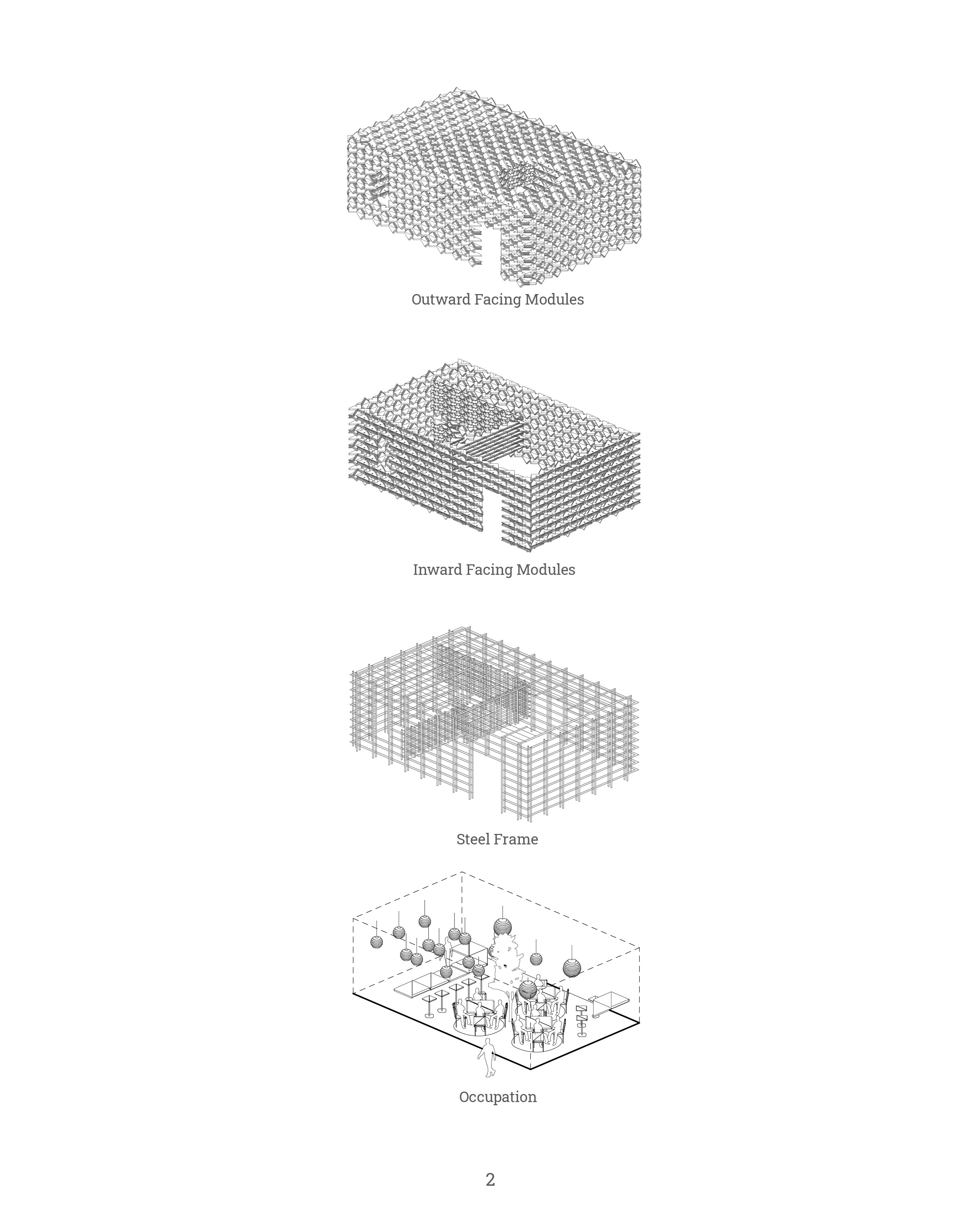 Ori was parametrically designed using Rhino and Grasshopper. In order to turn this proposal into a feasible project, the design was heavily inspired by modular origami. The construct features a base module that may be altered to create 3 variations and a light steel frame that is capable of receiving these modules.