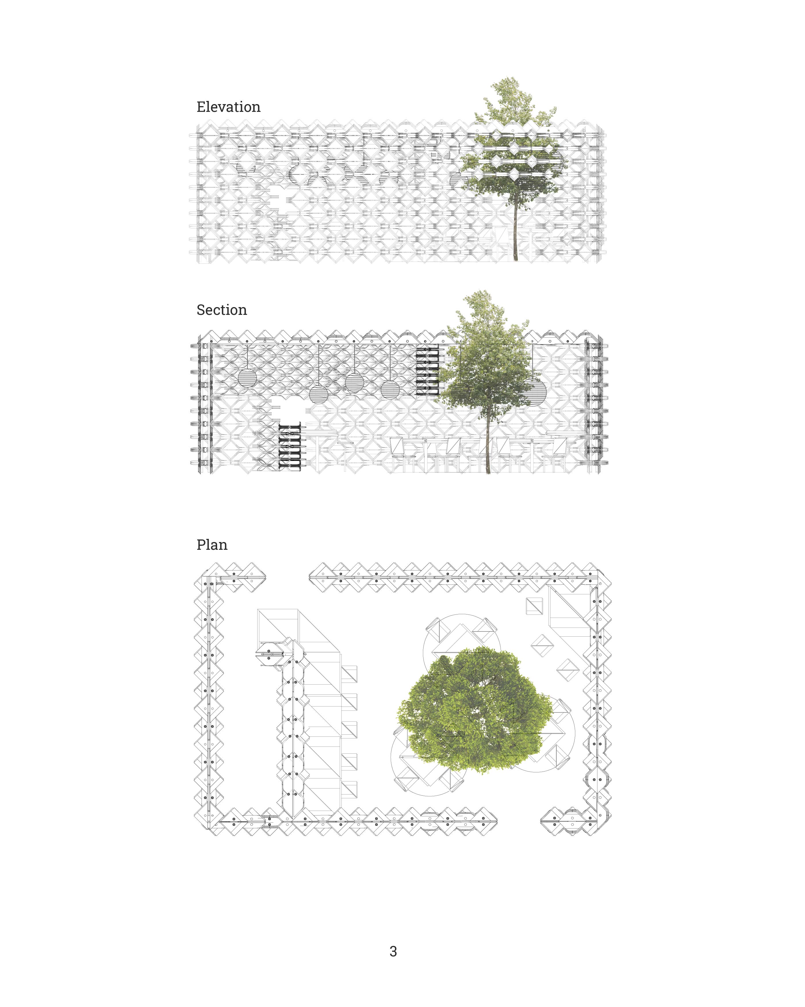Located in the heart of the Portland Japanese Garden Cultural Village, Ori functions as an outdoor tea bar. Its adjacency with the Umami Cafe opens up outdoor dining options, and its proximity to the Jordan Schnitzer Japanese Arts Learning Center allows for curious guests to become directly involved in its construction and maintenance. The skin of this origami-inspired pavilion is made up of water-proofed cardboard panels that can easily be assembled from flat sheets by following 4 sets of simple folds.