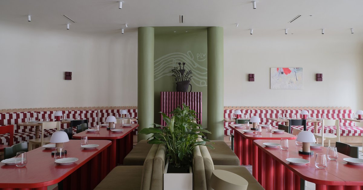 The conceptual foundation draws from the Memphis movement that originated in Milan, known for its graphic shapes, unexpected color combinations, and expressive character. NAAW adapts this aesthetic into a contemporary dining setting by blending the brand’s visual identity with local materials, bespoke craftsmanship, and current hospitality design sensibilities. Scarlet and olive tones—core to the restaurant’s palette—define the space and reinforce brand recognition, giving the interior a strong and memorable visual signature.
